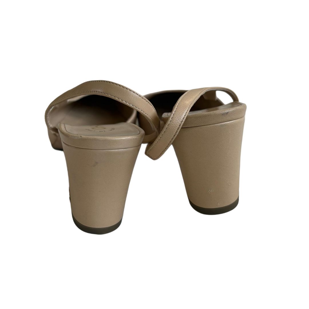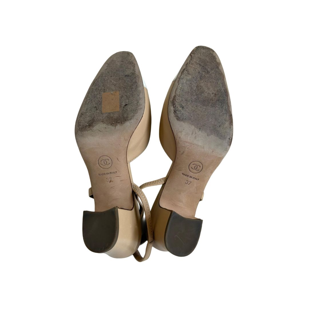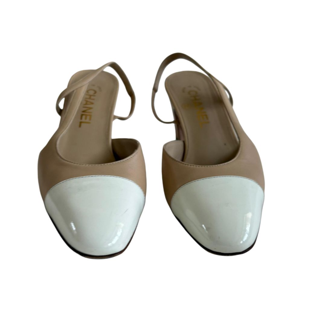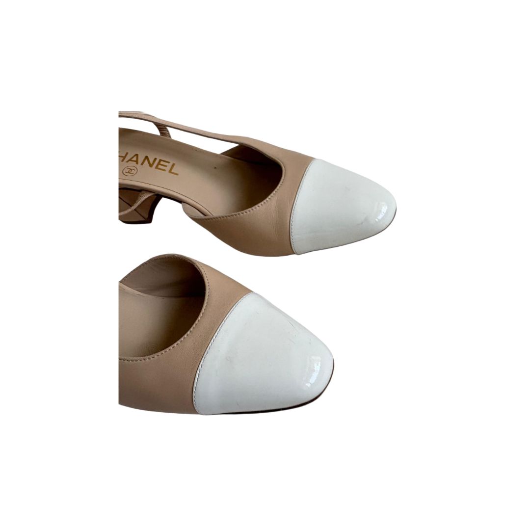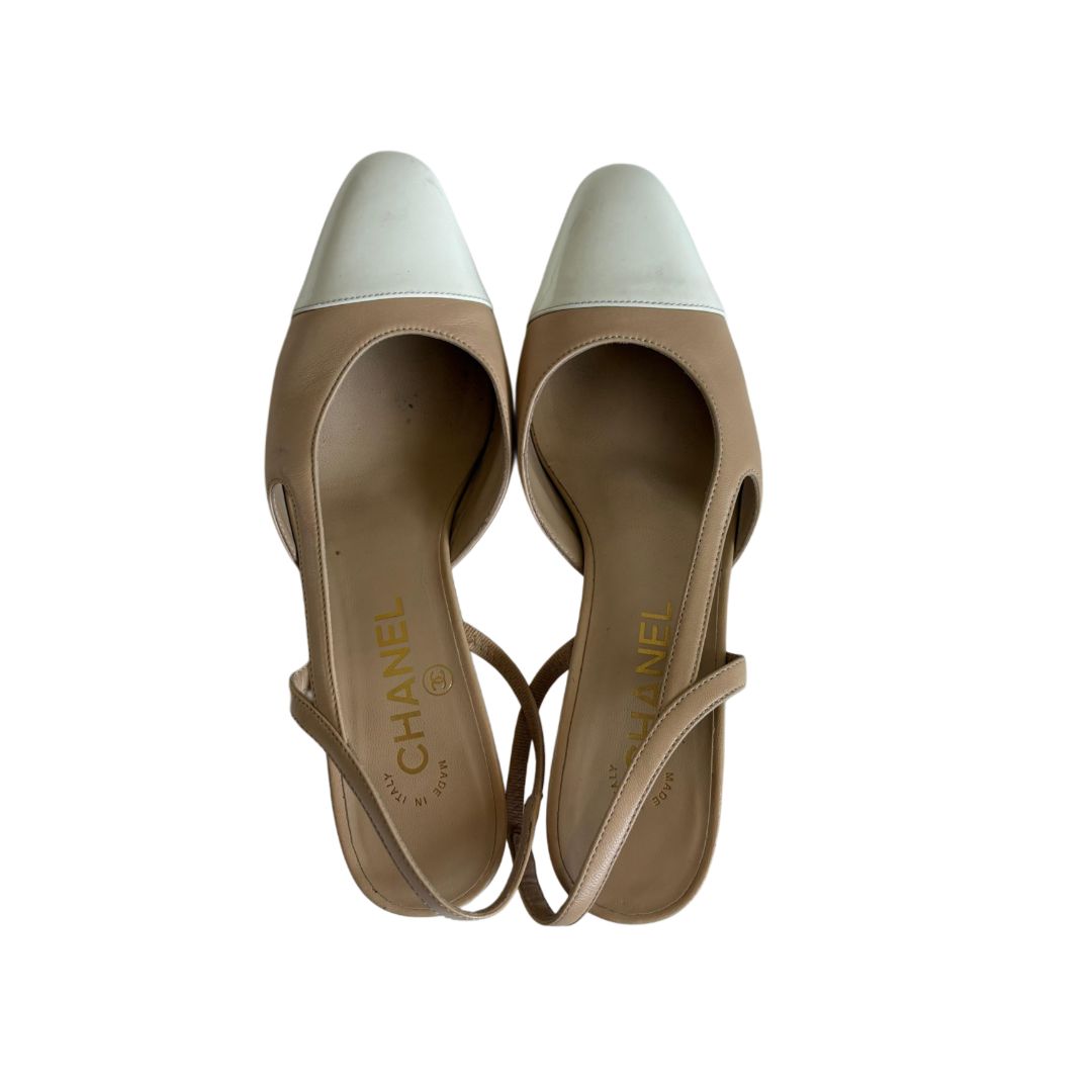 Chanel Leather Nude and White Cap Toe Sling Back Heels Pumps, size 37
