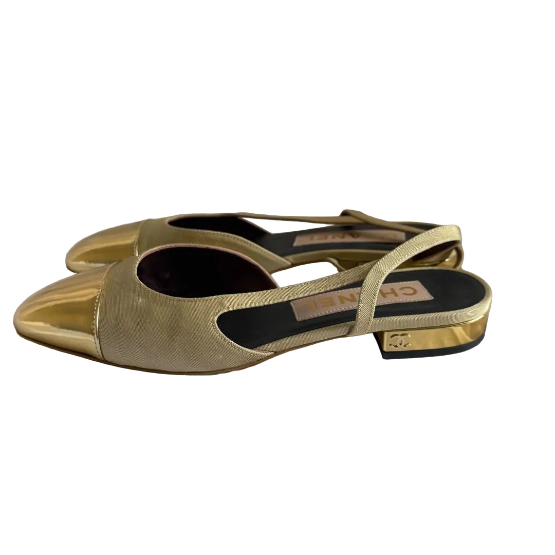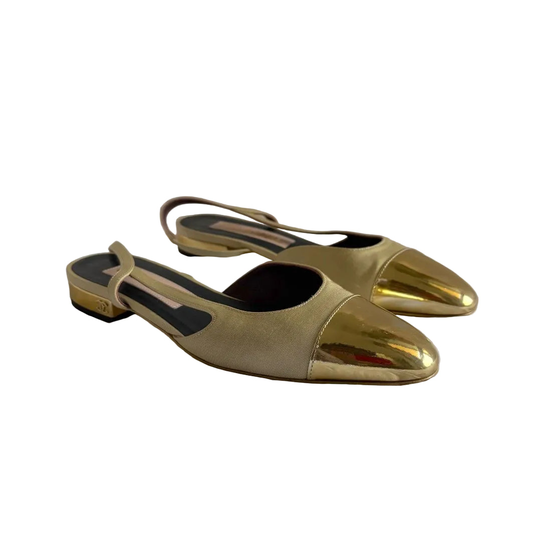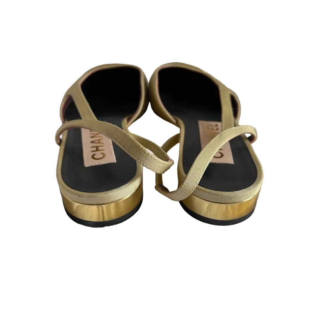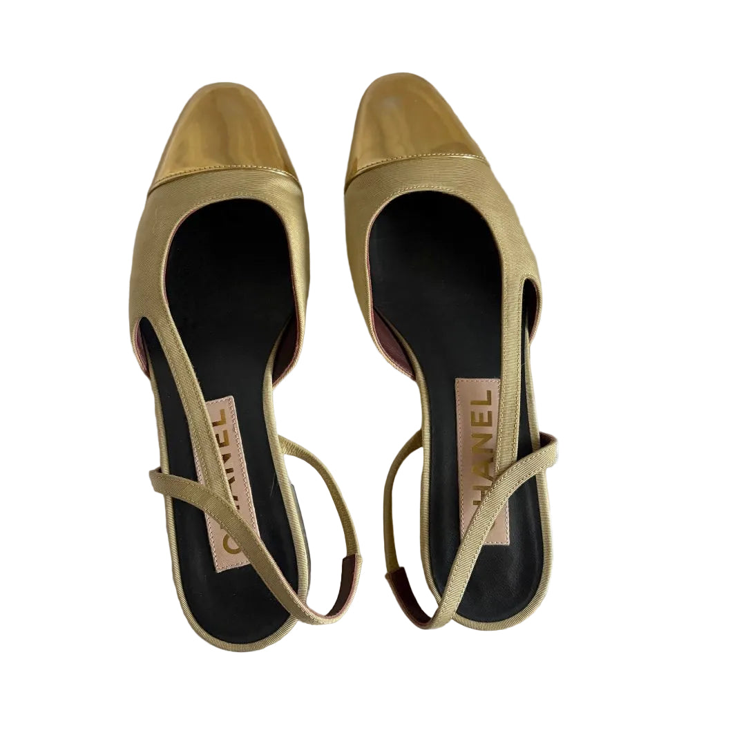 Chanel Ridged Satin With Gold Cap Toe Slingback Flat, size 37C