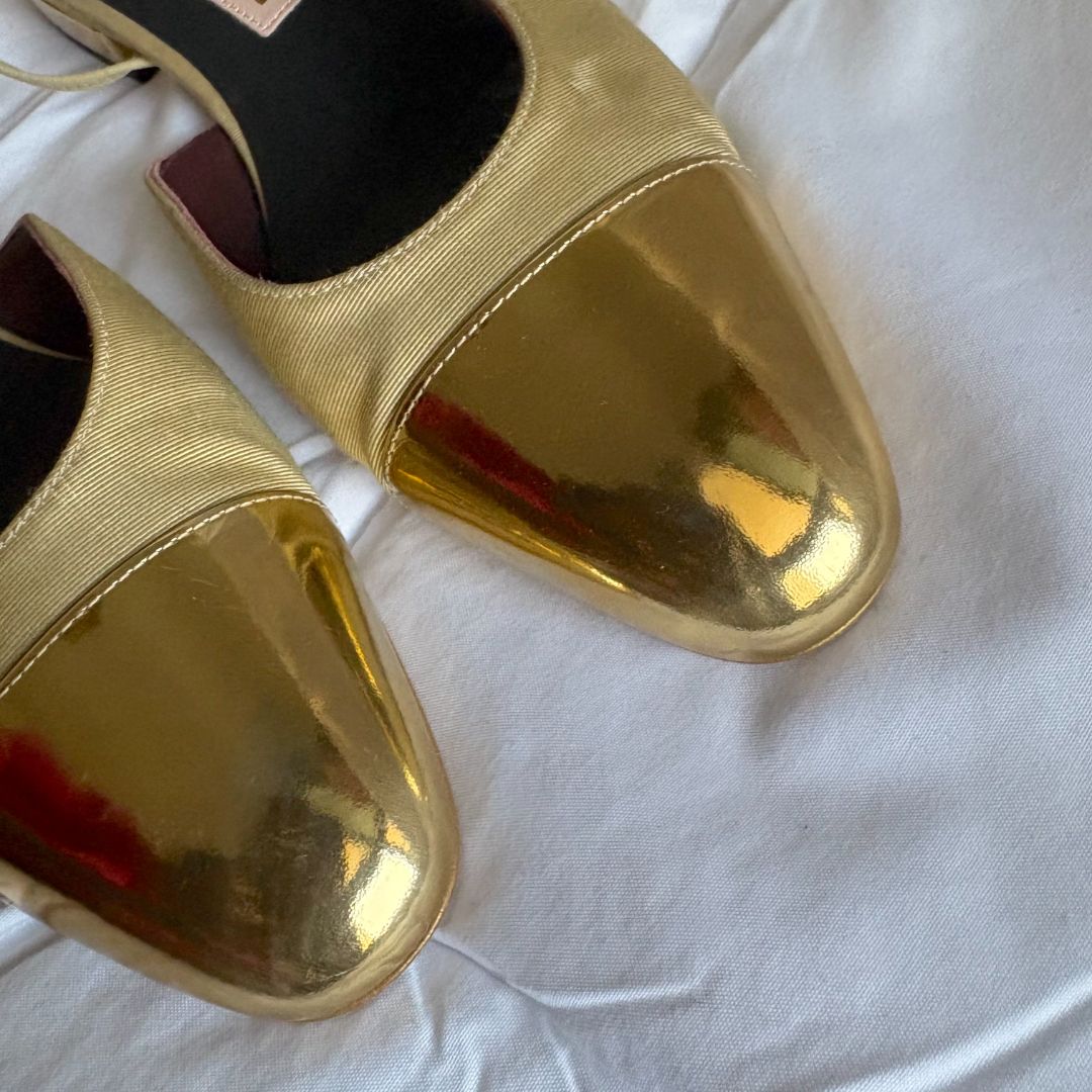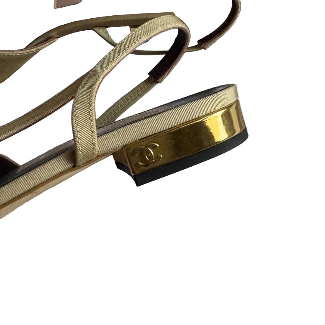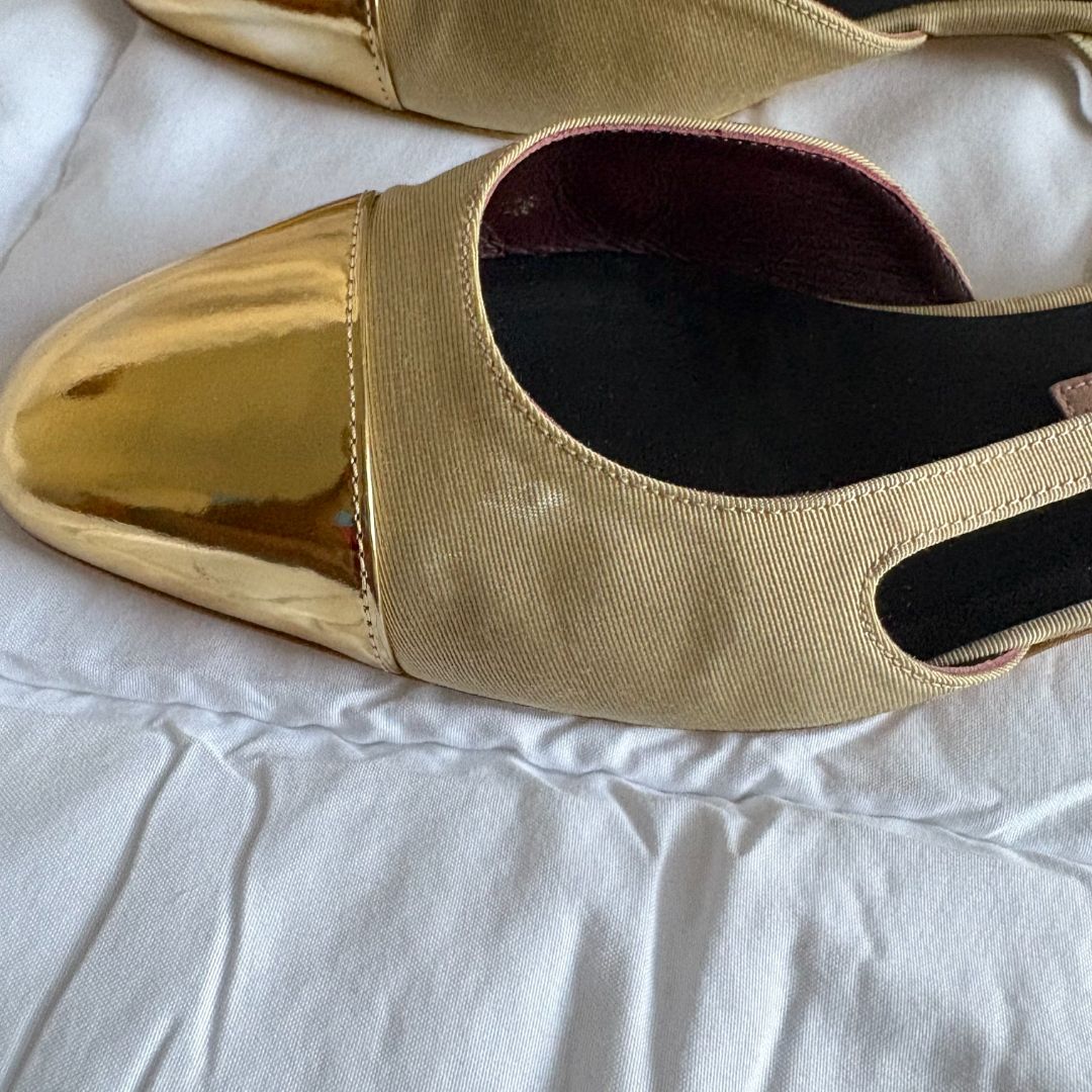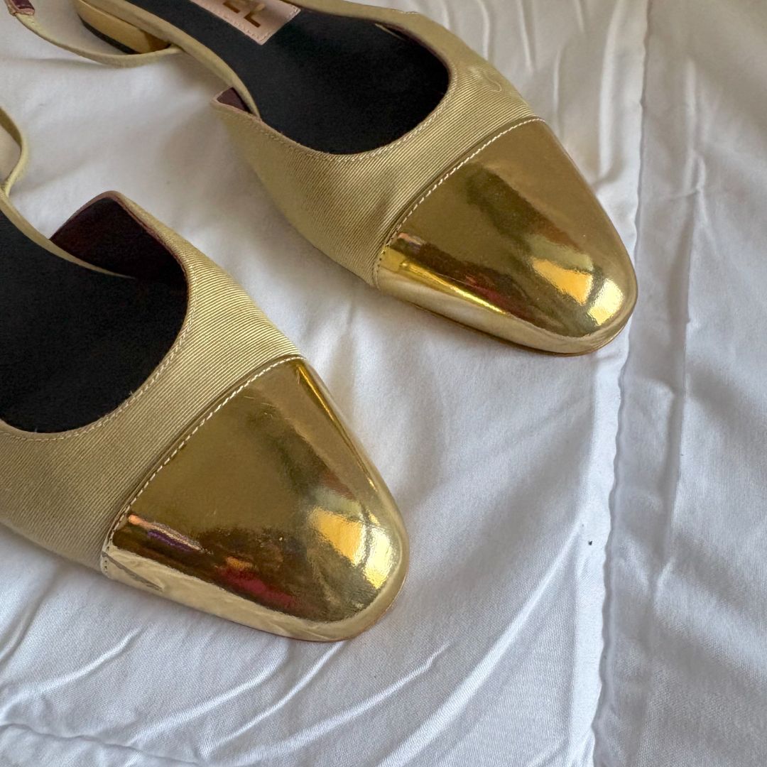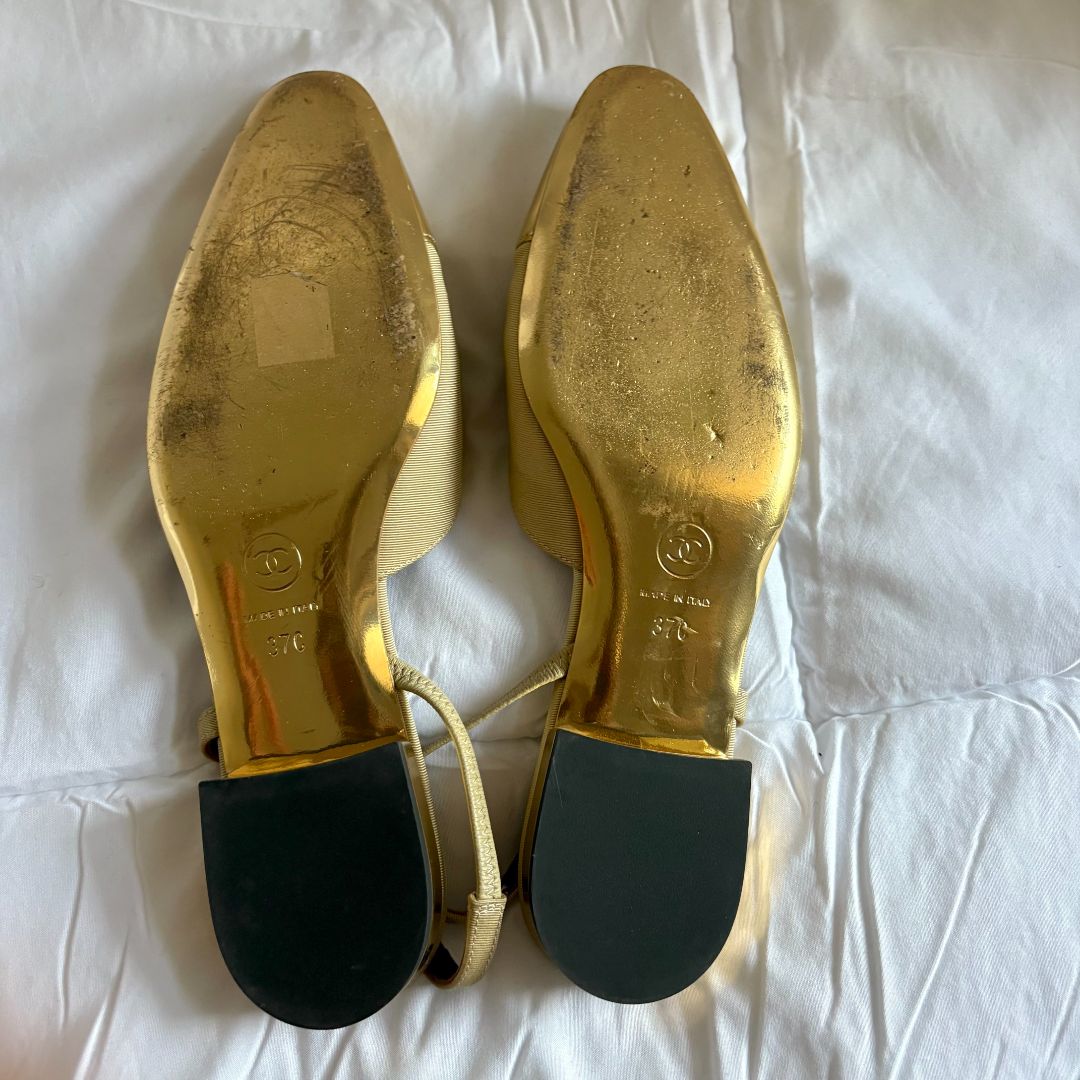 Chanel Ridged Satin With Gold Cap Toe Slingback Flat, size 37C