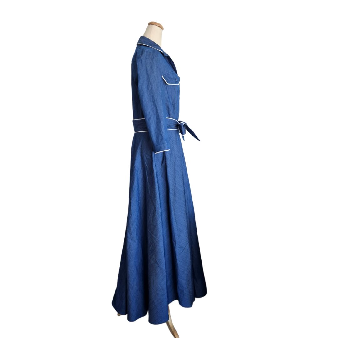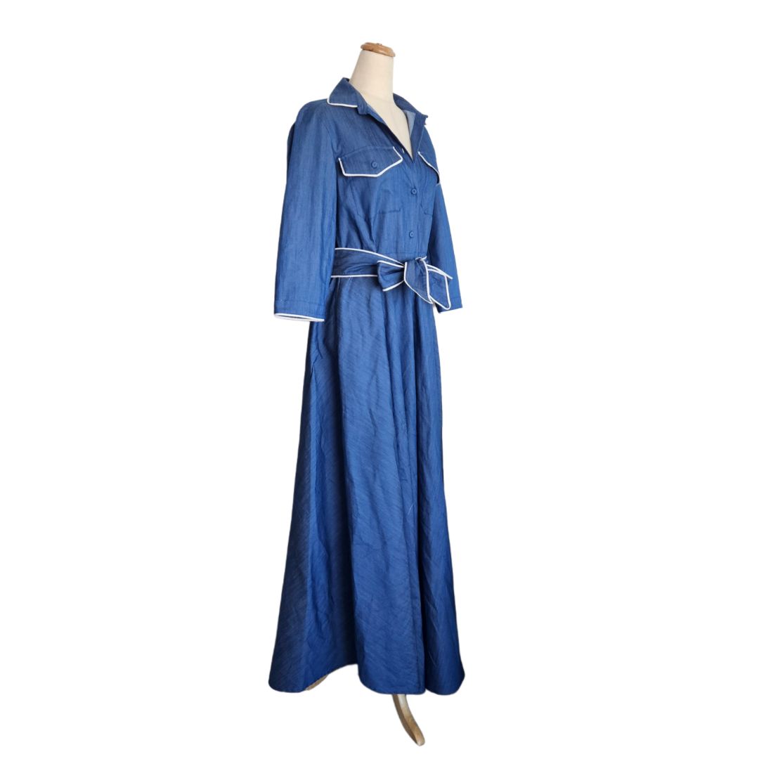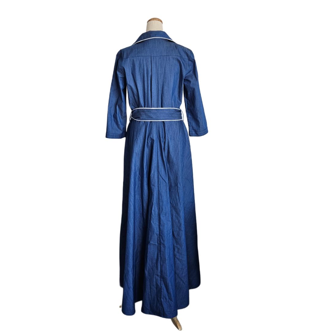 Luisa Beccaria Blue Denim With White Trim Maxi Belted Dress