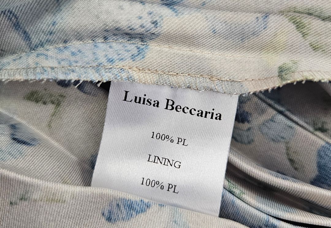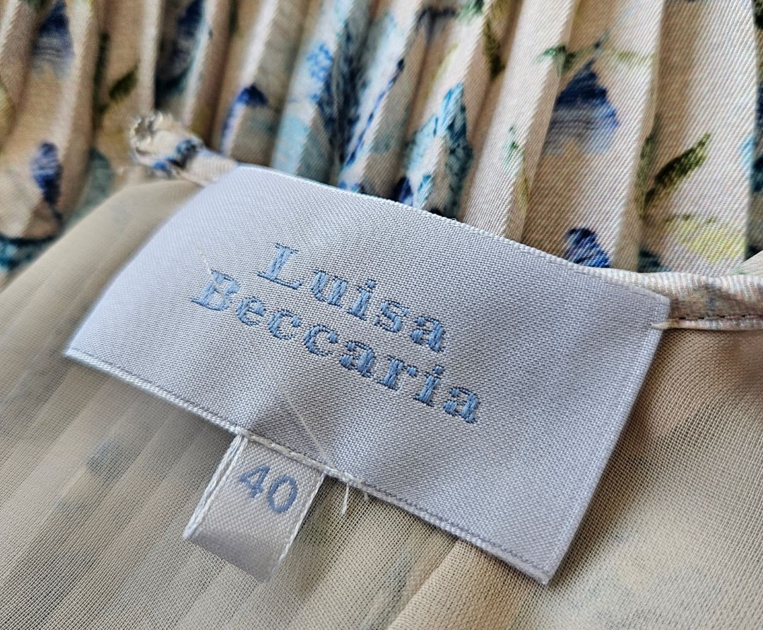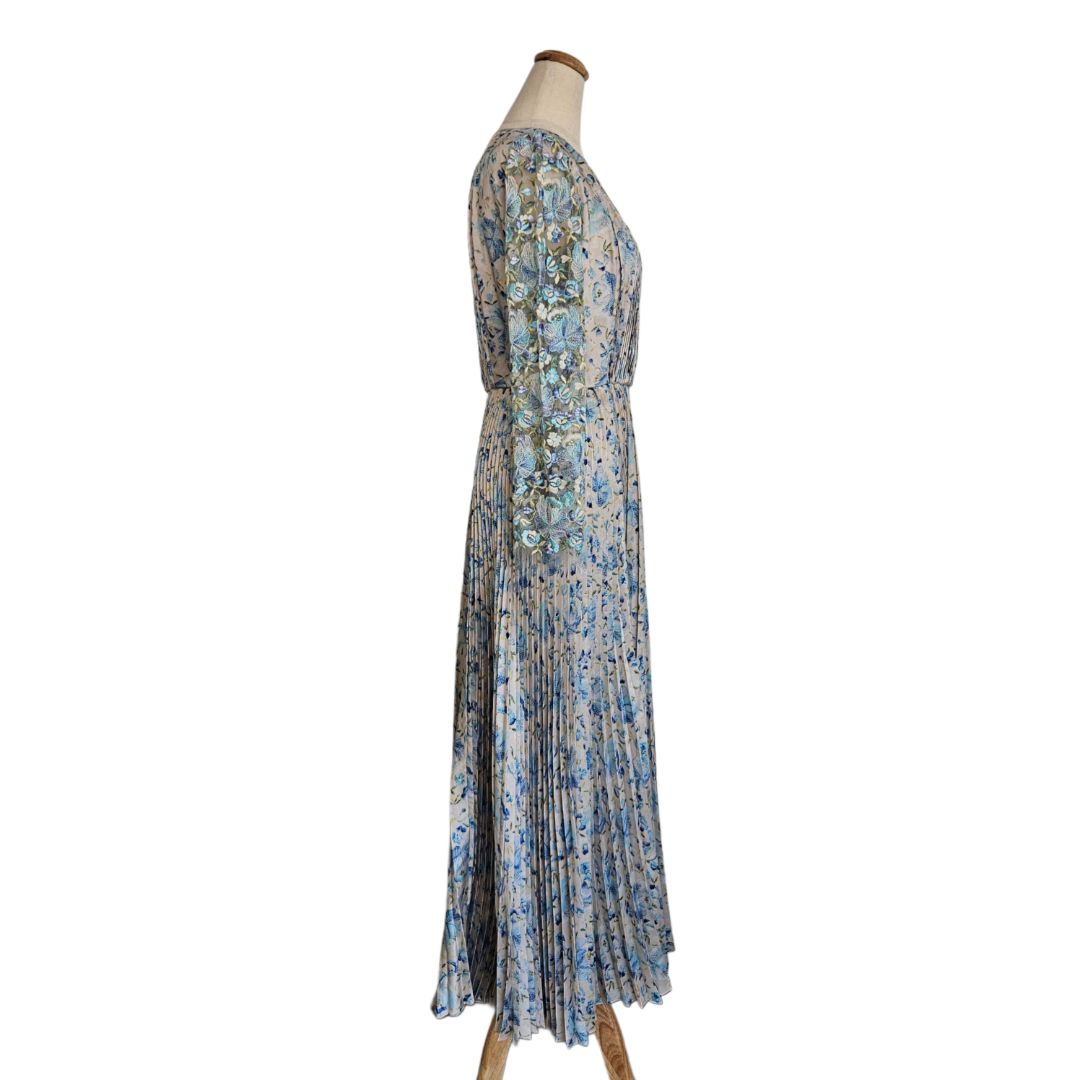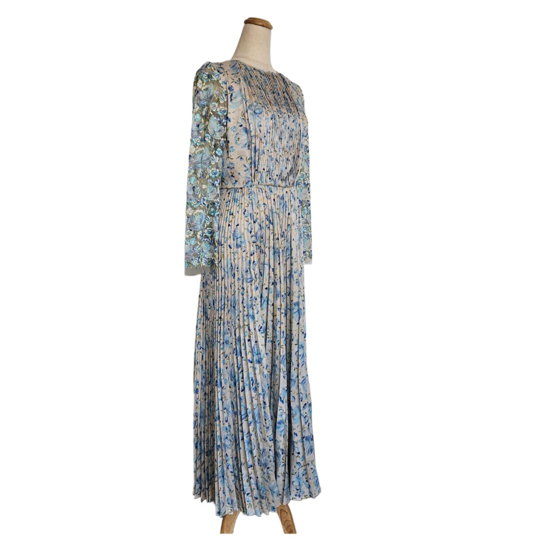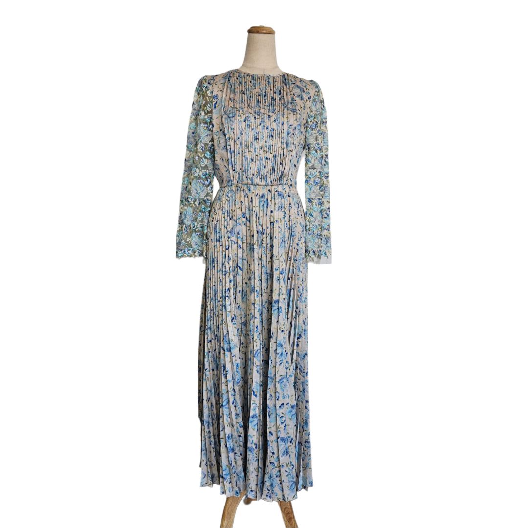 Luisa Beccaria Blue Pleated With Floral Embroidered Sleeves Maxi Dress