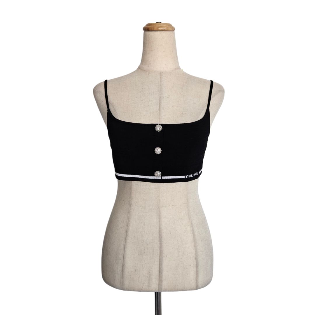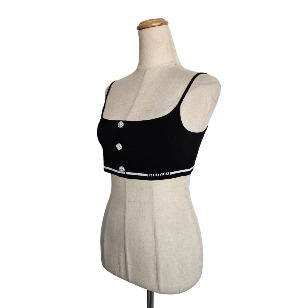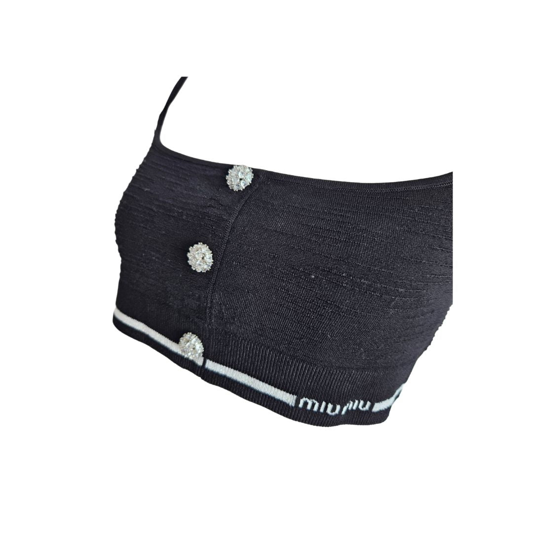 Miu Miu Black Crystal Embellished Button Stretch Knit Crop Top