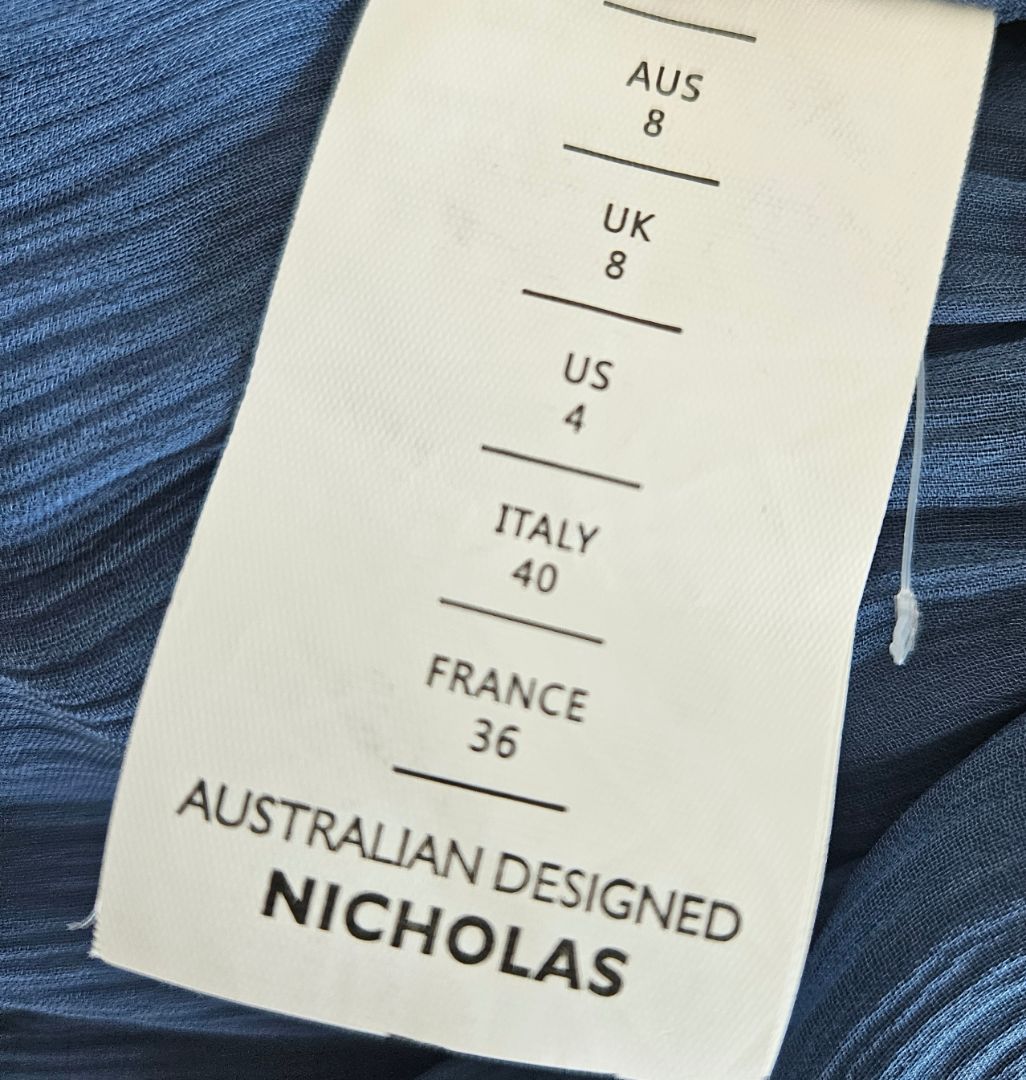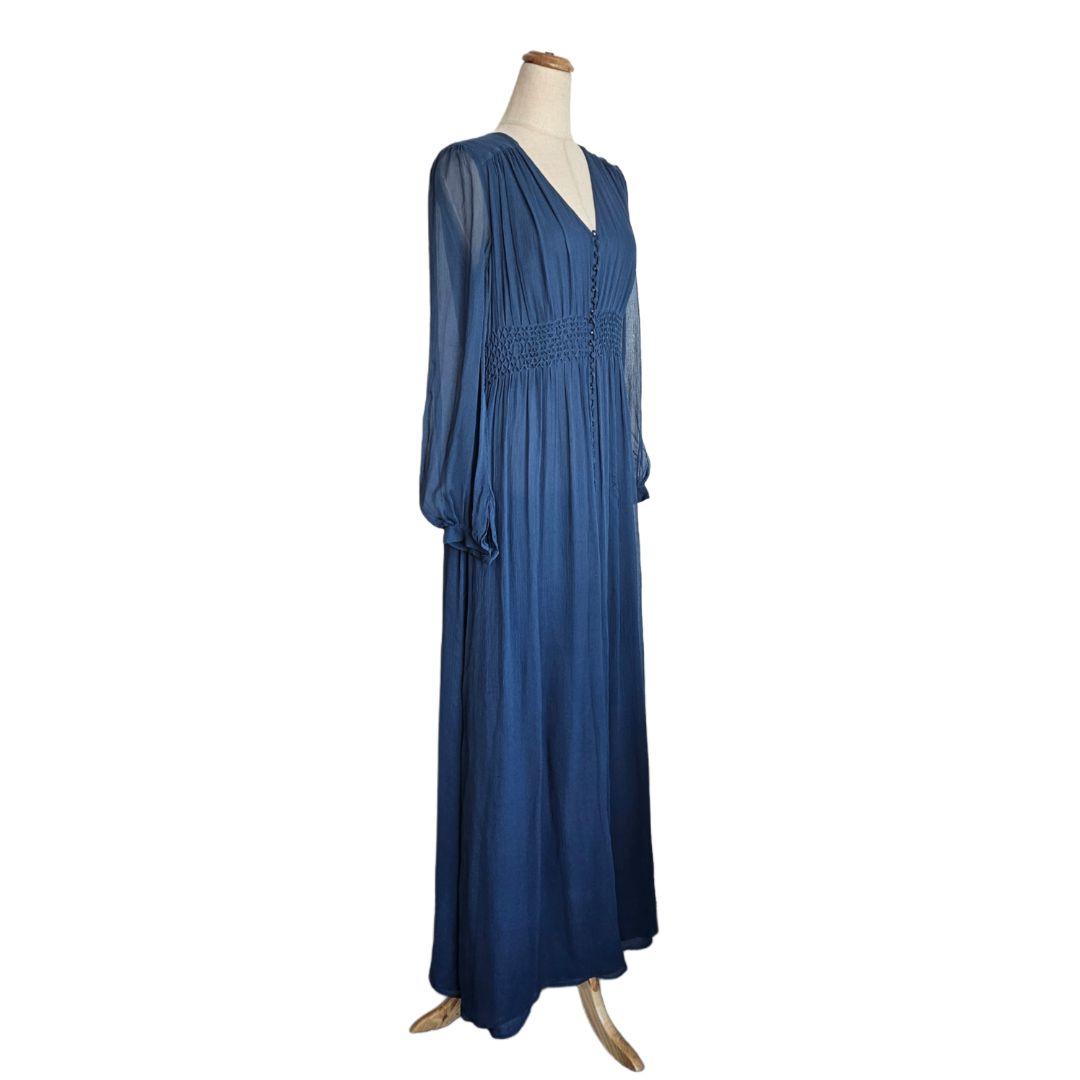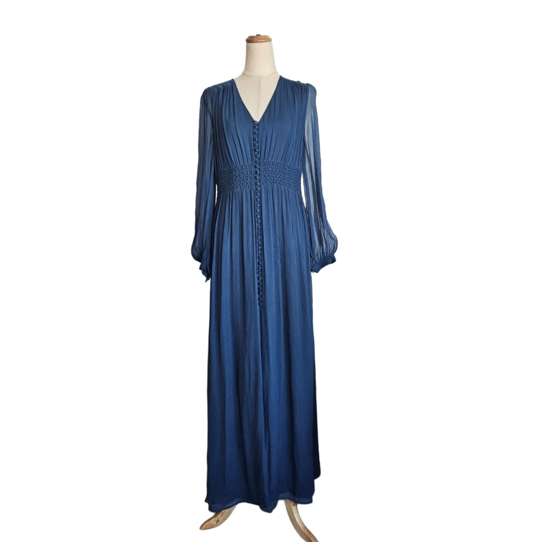 Nicholas Blue Sheer Long Sleeve with Buttons and Ruched Waist Detail Maxi Dress