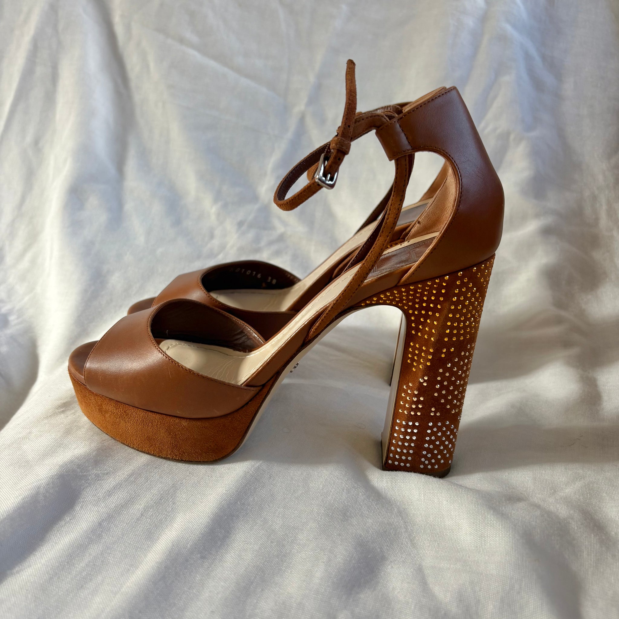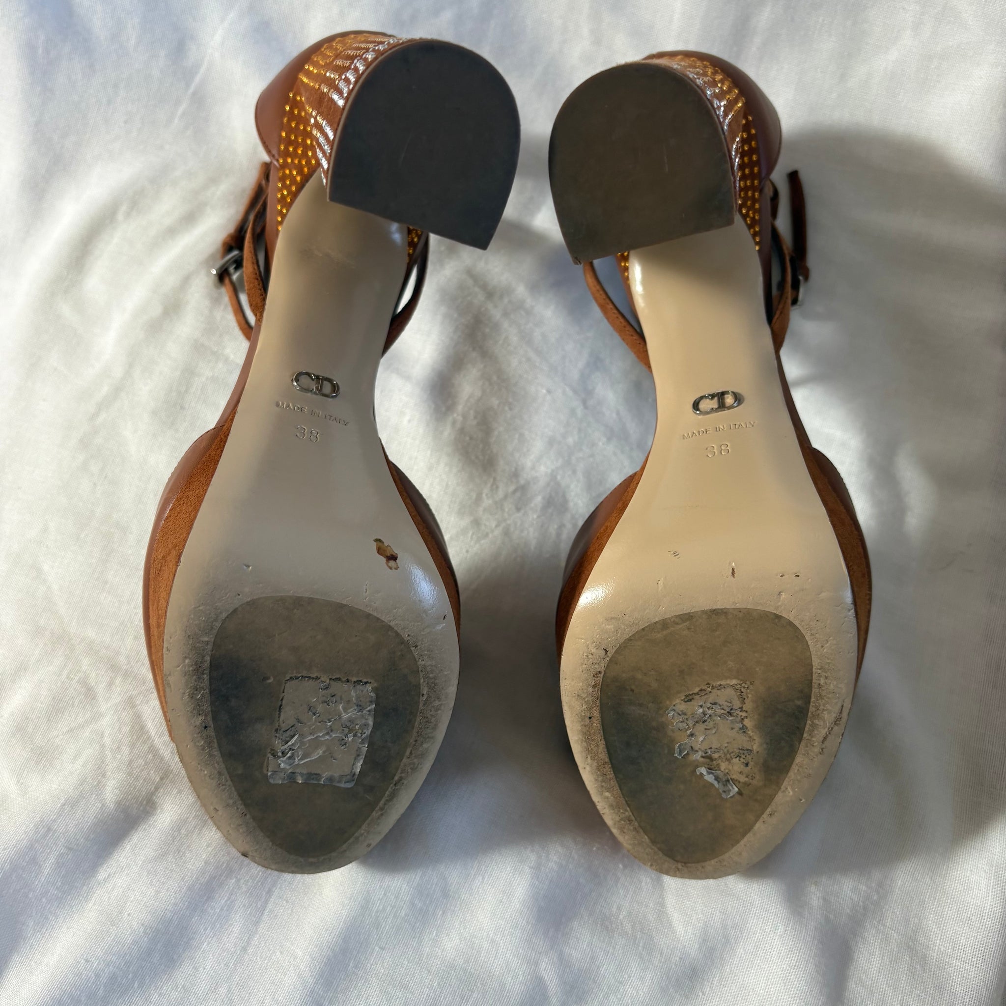 Christian Dior tan leather studded chunk heel suede and leather ankle strap sandals, size 38