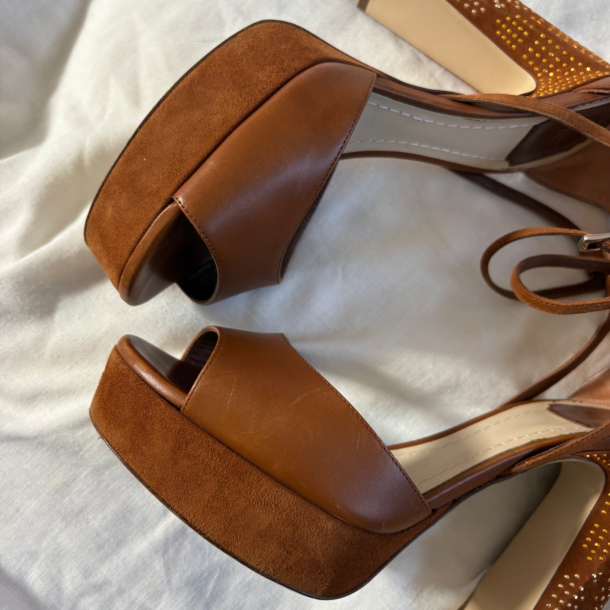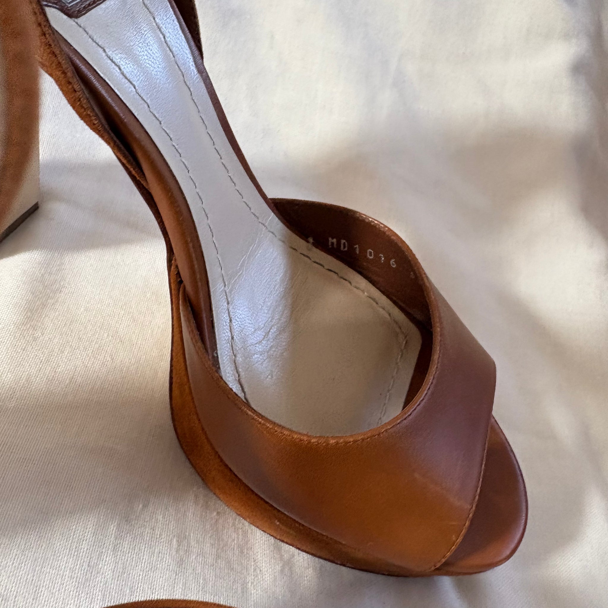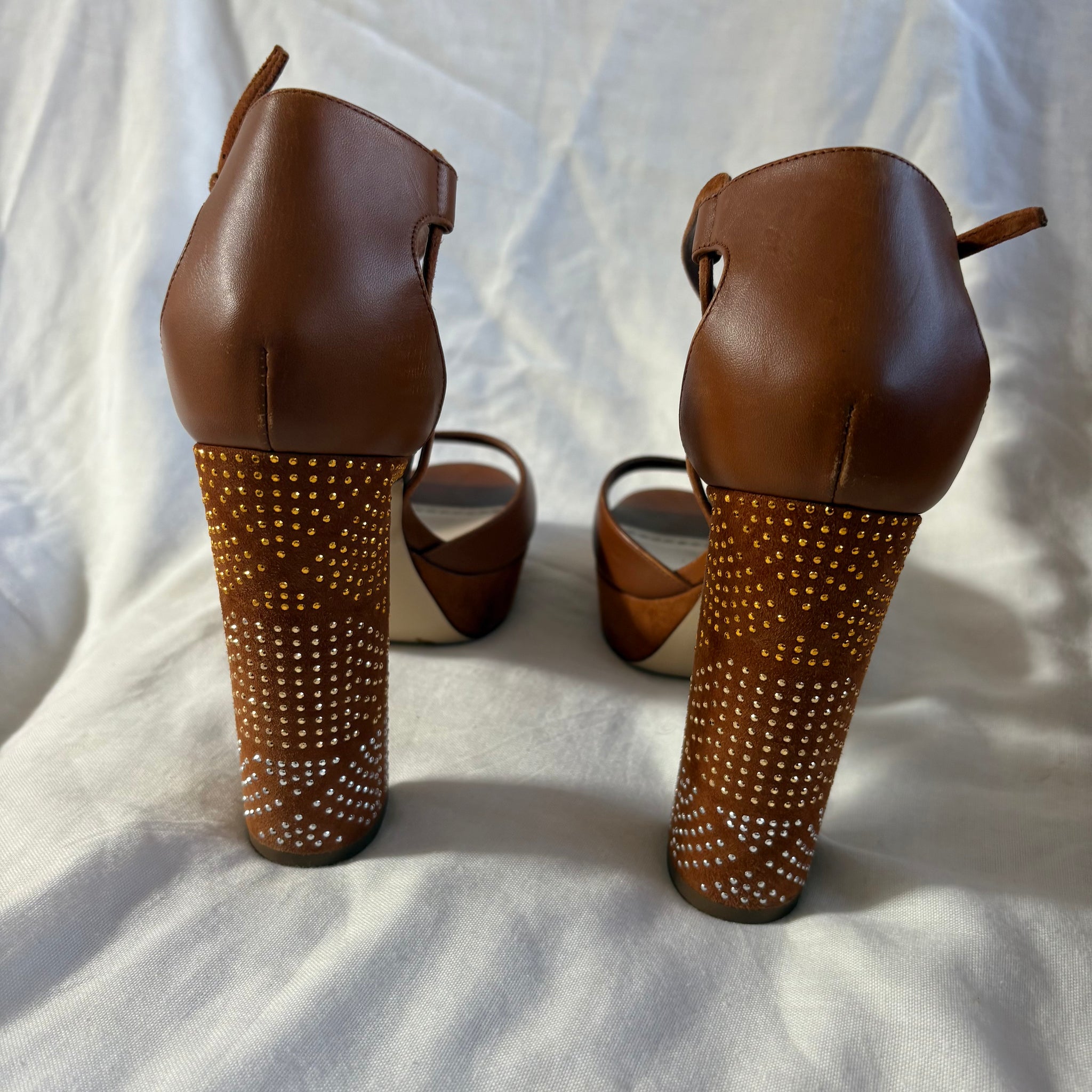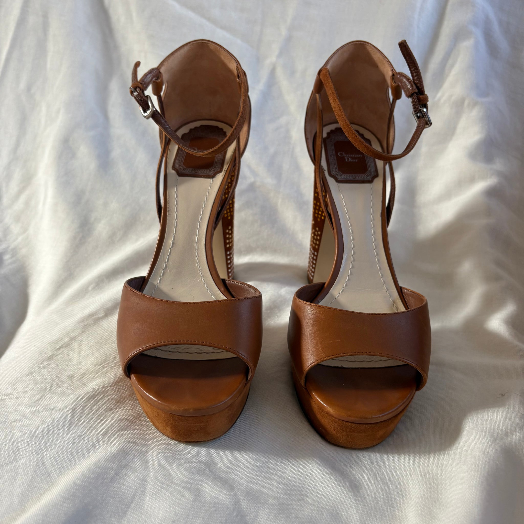 Christian Dior tan leather studded chunk heel suede and leather ankle strap sandals