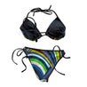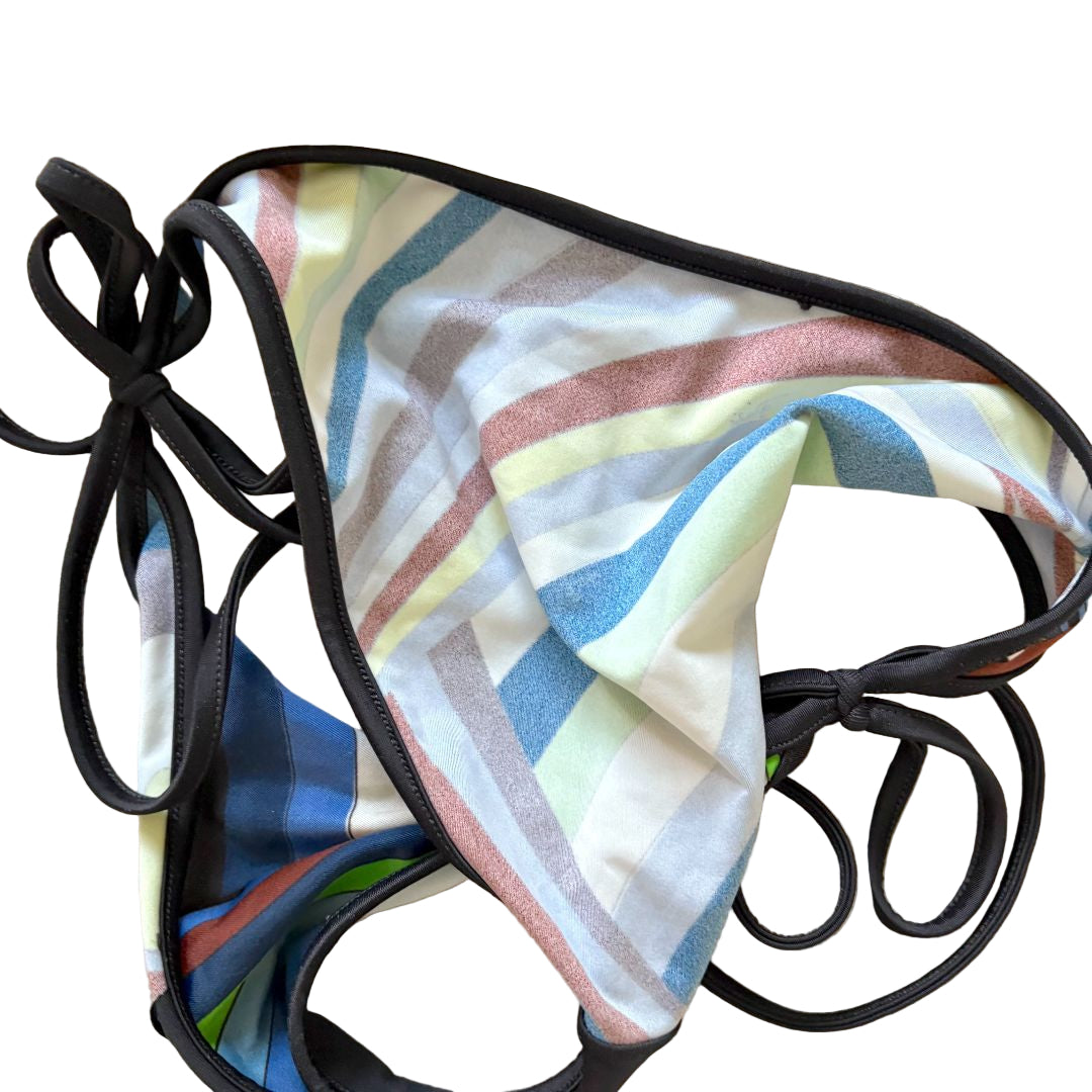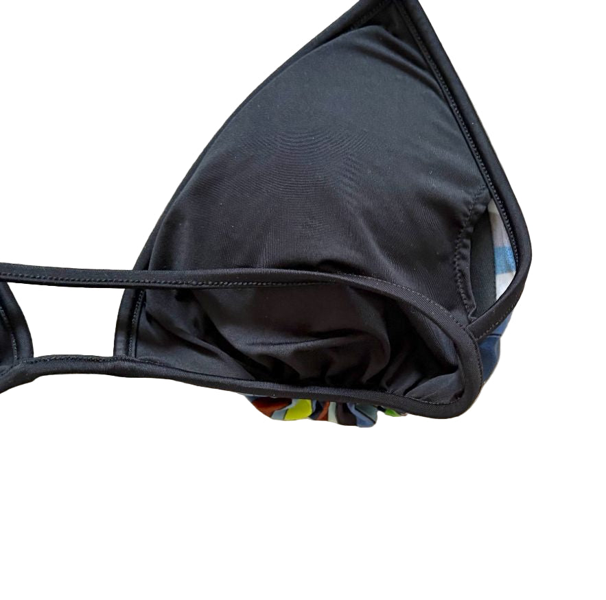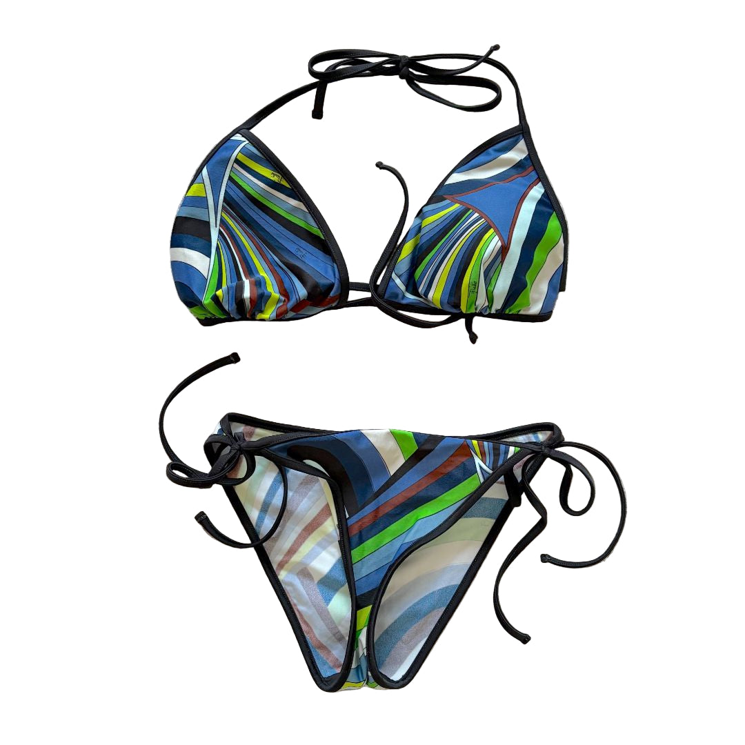 Emilio Pucci Printed Bikini with removable padding. Iride-print design features black trims and triangle cups with removable paddings and sel-ftie straps for minimal coverage