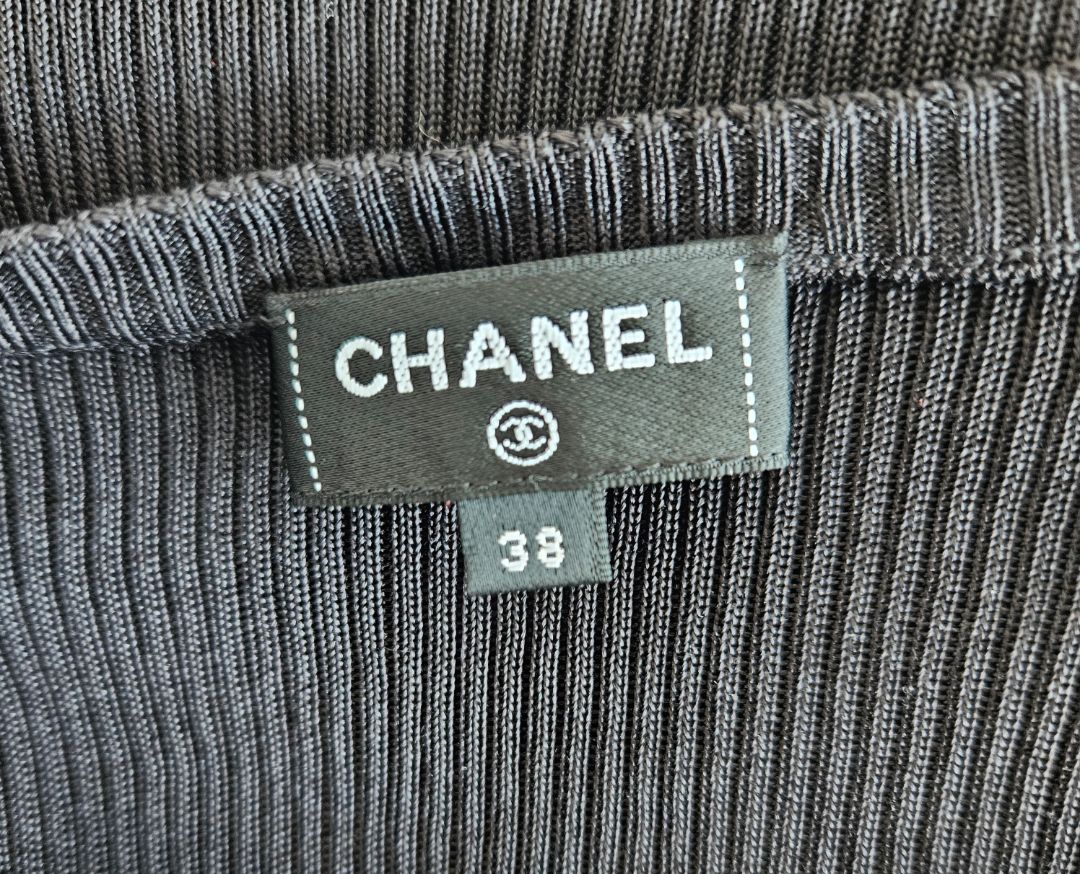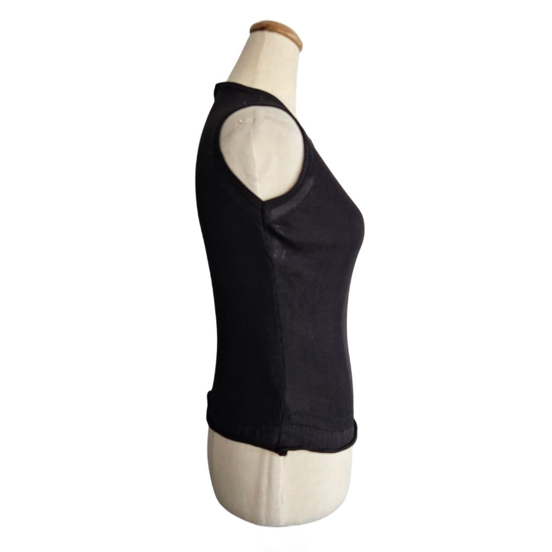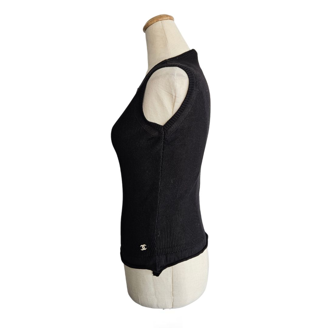 Chanel Black Sleeveless Ribbed CC Top with small crystal embellished CC detail on side of top