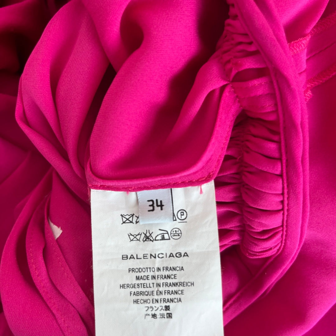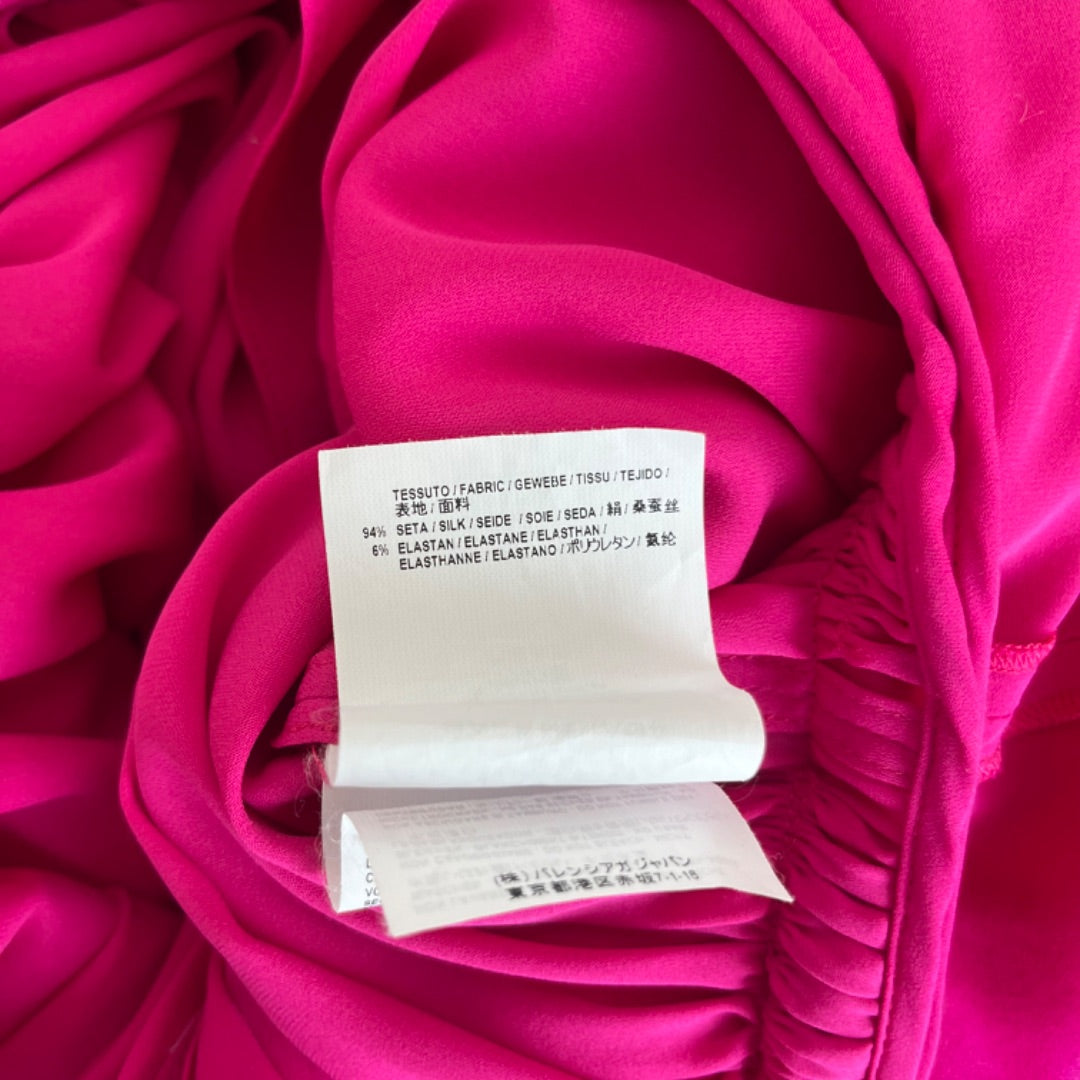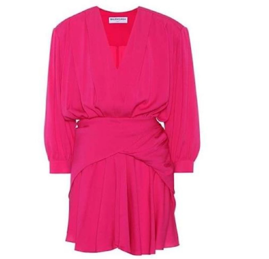 Balenciaga Pre-Fall 2017 (Look 28) hot pink silk dress, crafted from fluid silk, features exquisite gathering and draping for a stunning texture. Designed with waist-cinching ties, it has dropped padded shoulders and a gently ruffled hem that’s intentionally short—ideal for pairing with over-the-knee boots.