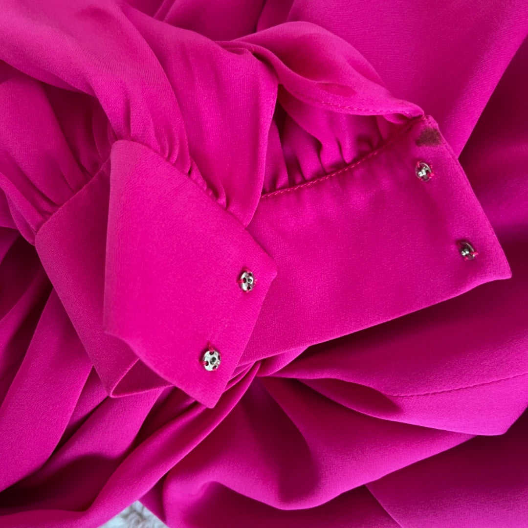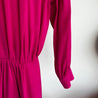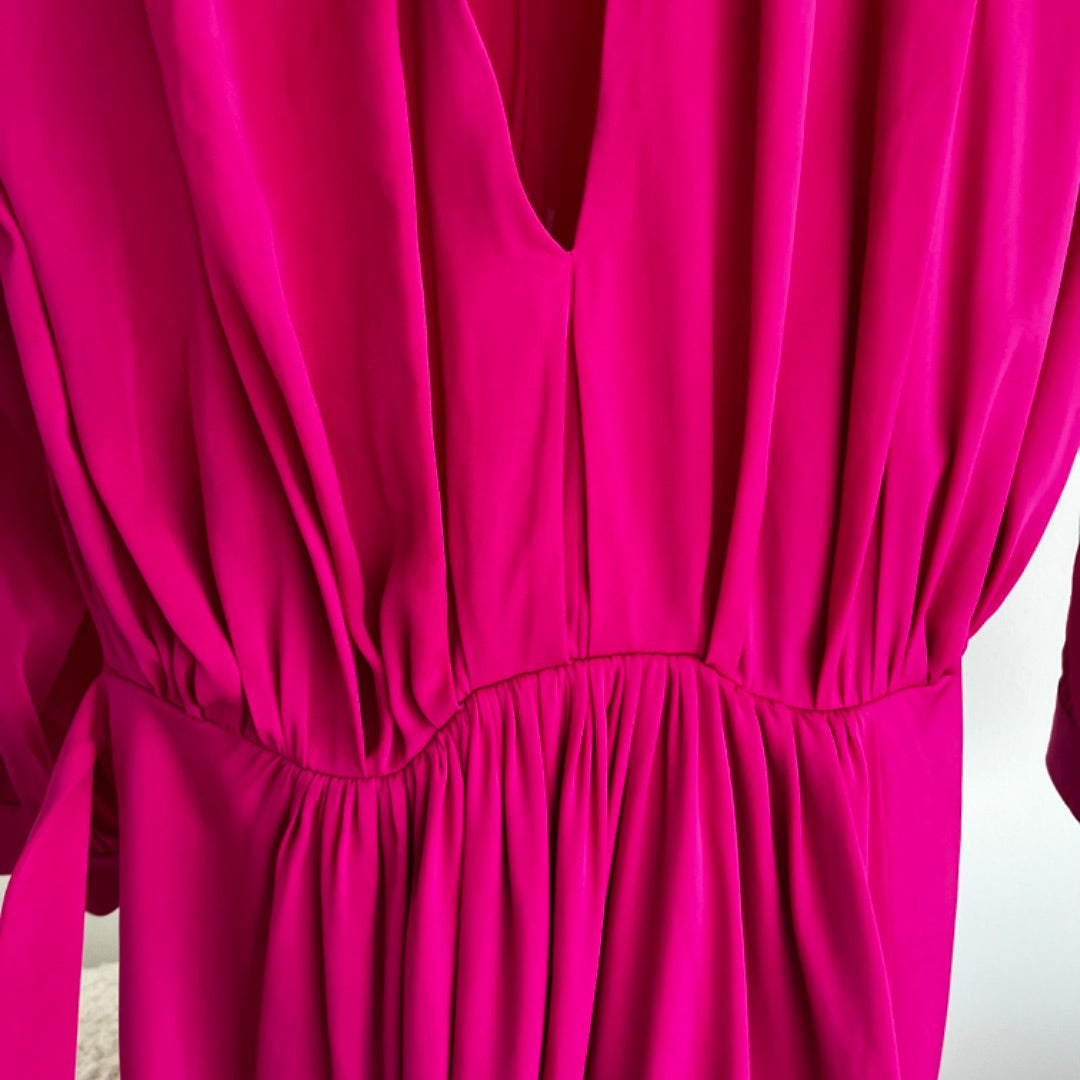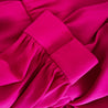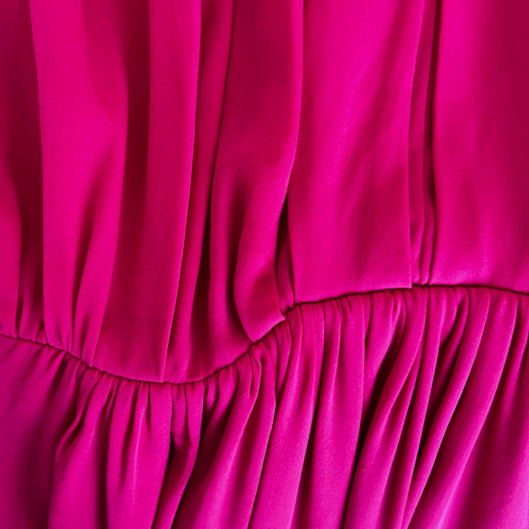 Balenciaga Pre-Fall 2017 (Look 28) hot pink silk dress, crafted from fluid silk, features exquisite gathering and draping for a stunning texture. Designed with waist-cinching ties, it has dropped padded shoulders and a gently ruffled hem that’s intentionally short—ideal for pairing with over-the-knee boots.
