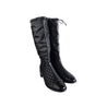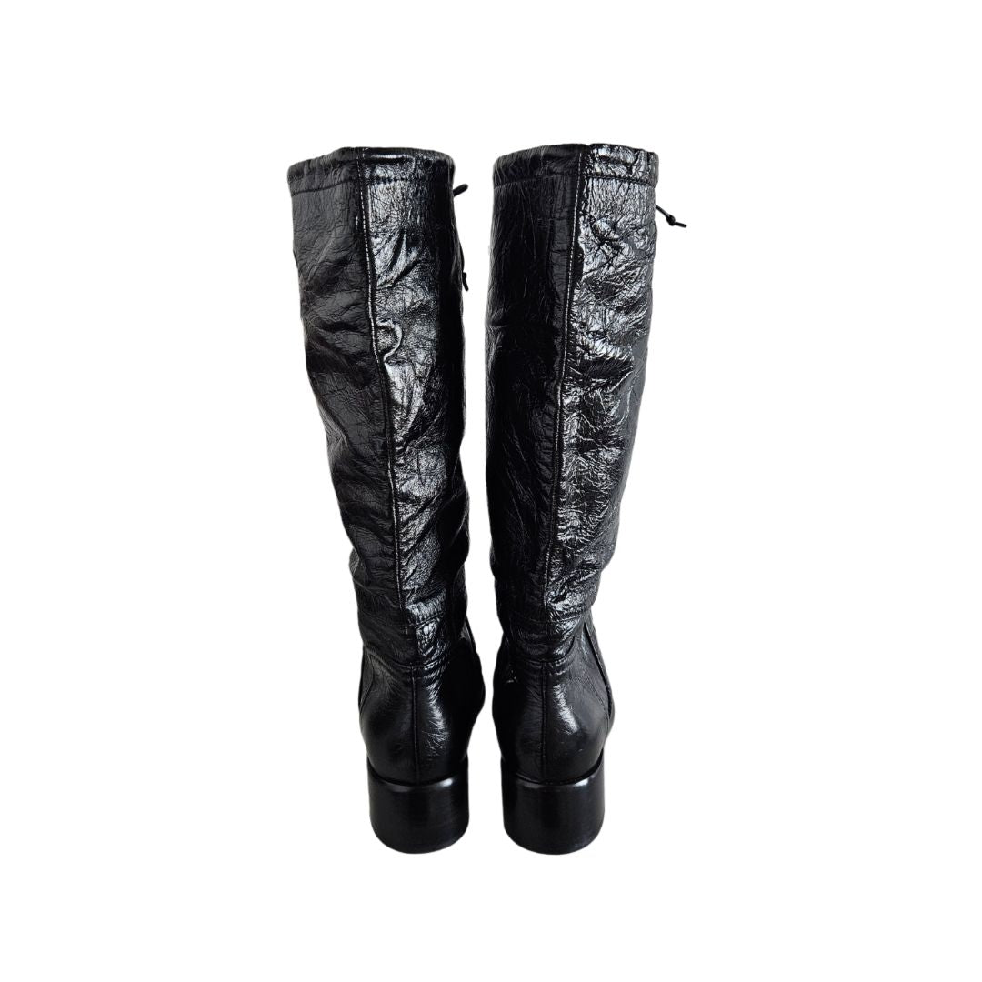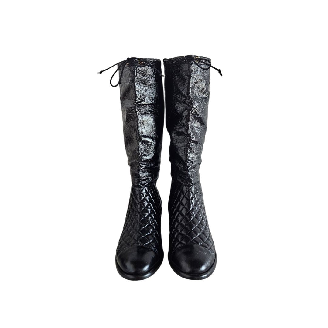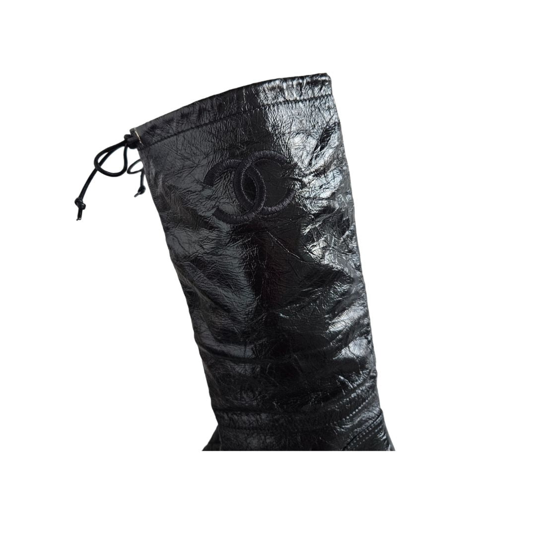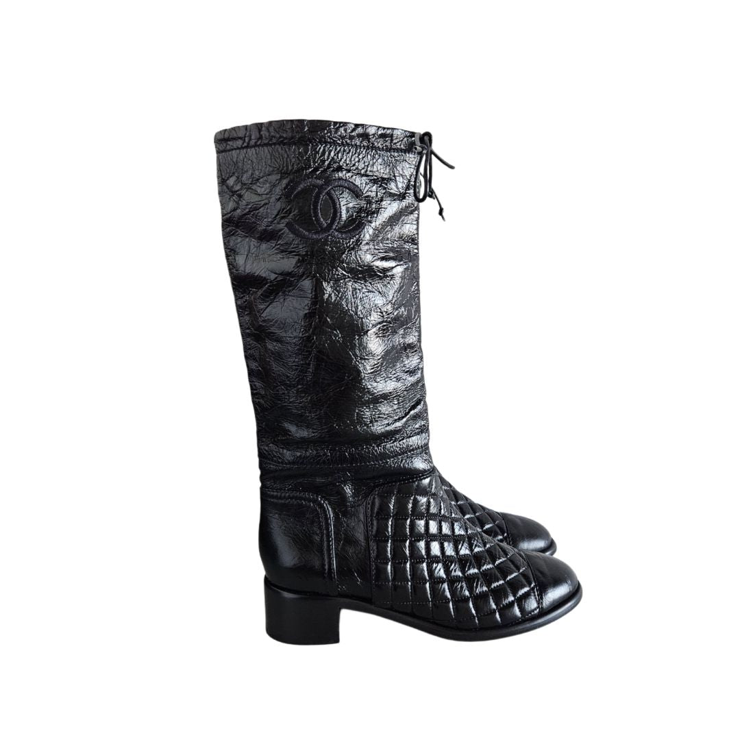 Chanel Black CC Aged Leather Drawstring Ankle High Boots, size 38.5
