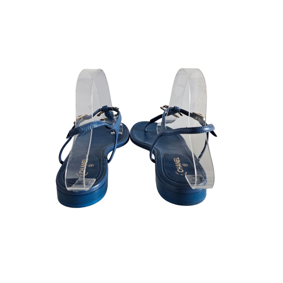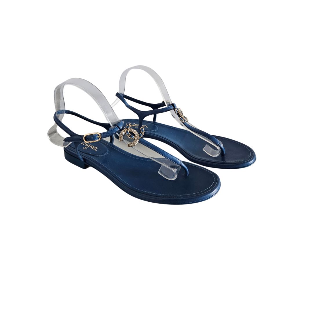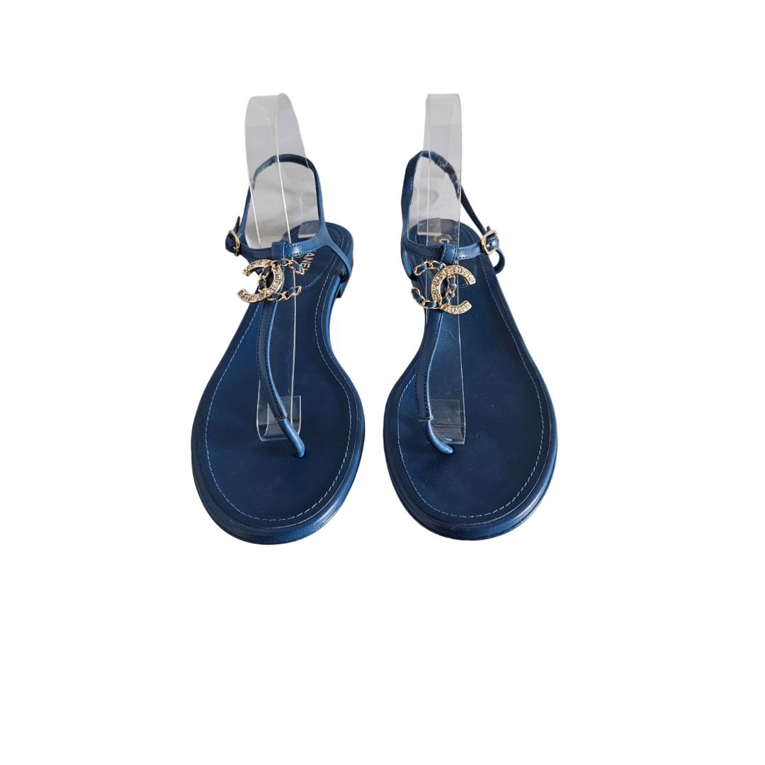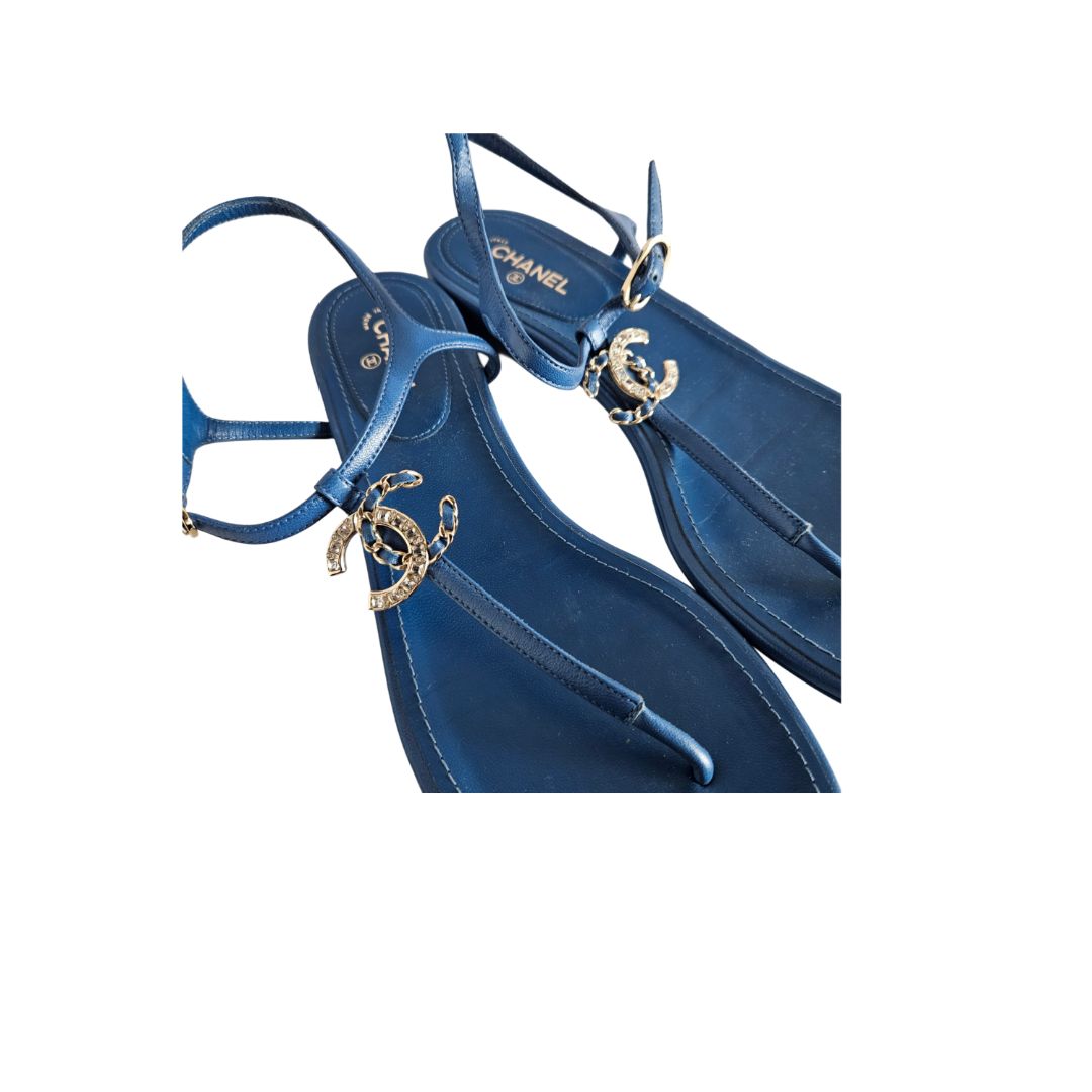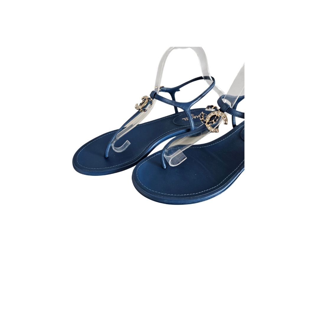 Chanel Blue Leather CC Crystal Logo Thong Flat Sandal