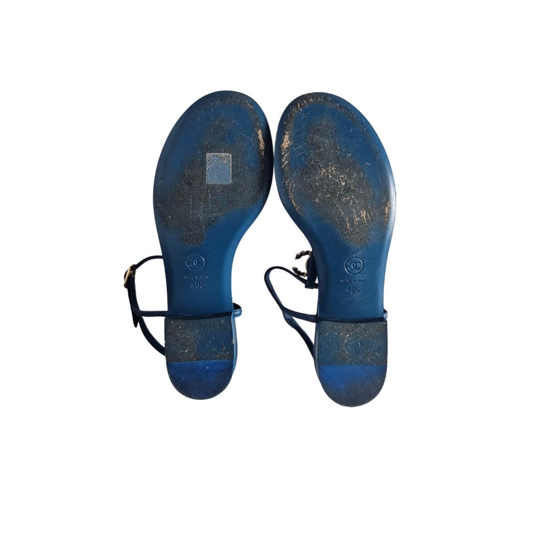 Chanel Blue Leather CC Crystal Logo Thong Flat Sandal,Size 40C