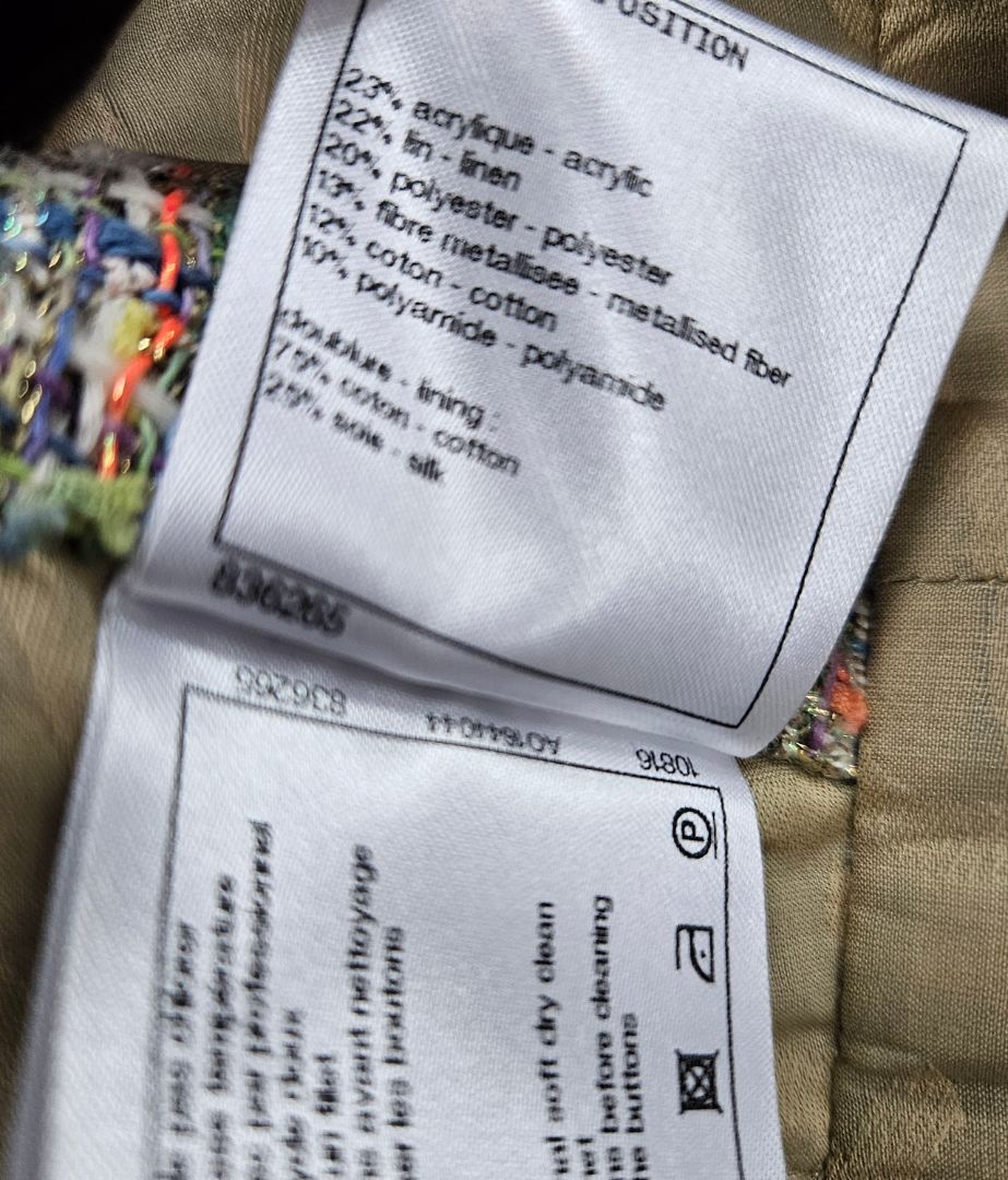 Material: 23% acrylic, 22% linen, 20% polyester, 13% metalized fiber, 12% cotton, 10% polyamide