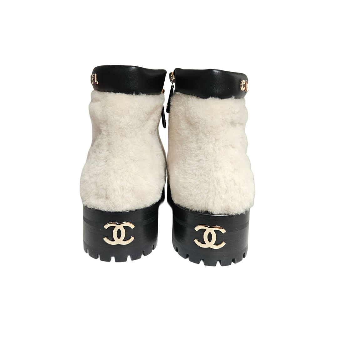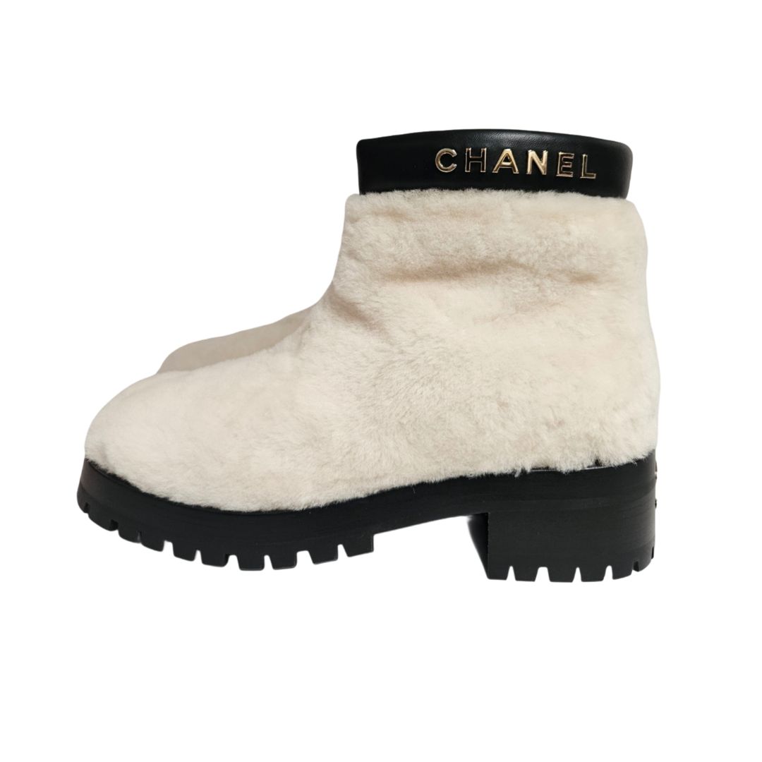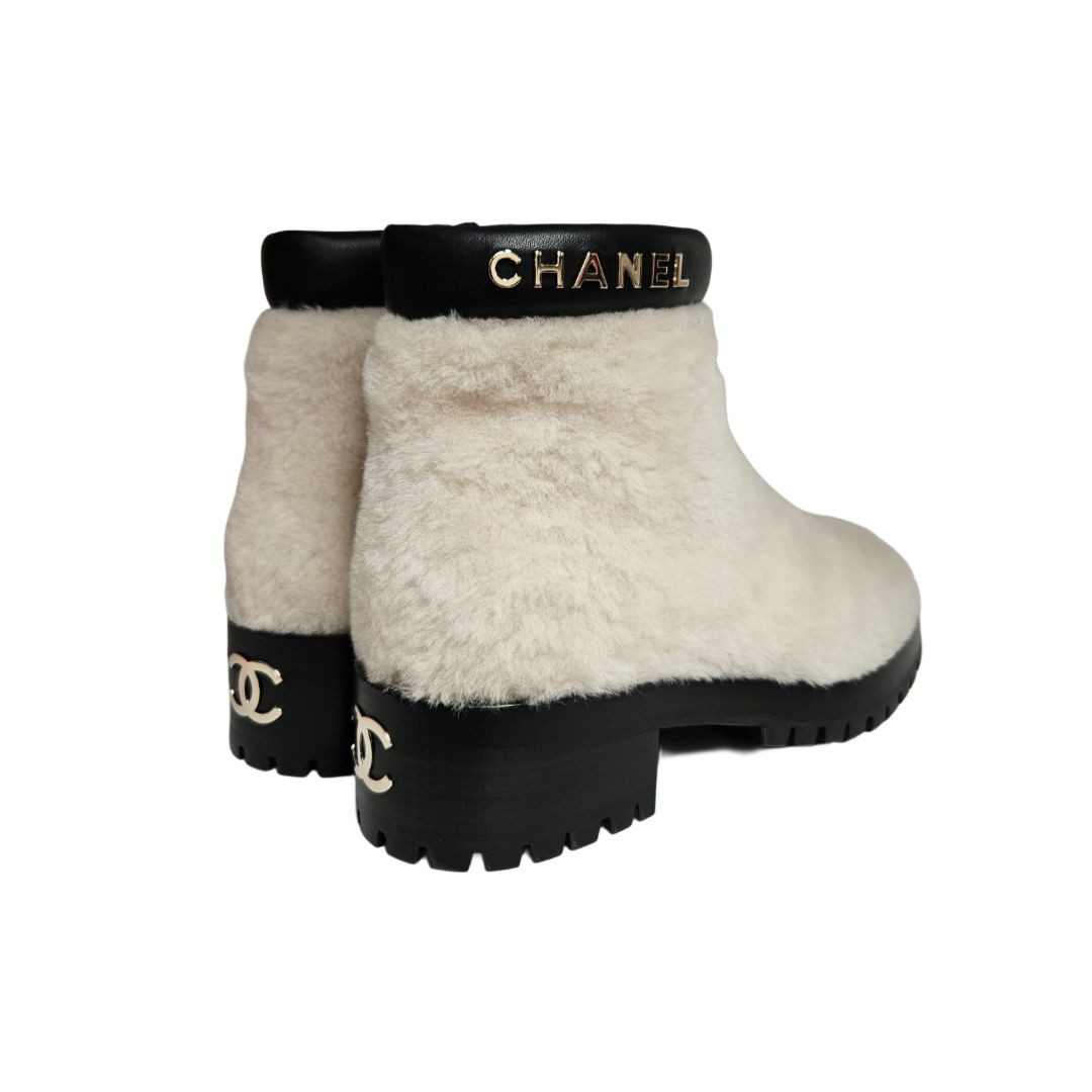 Chanel White Leather and Shearling CC Logo Ankle Bootie, Size 39