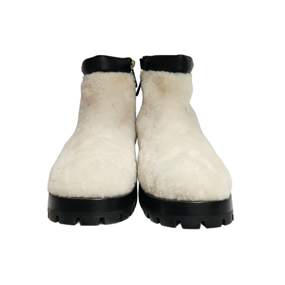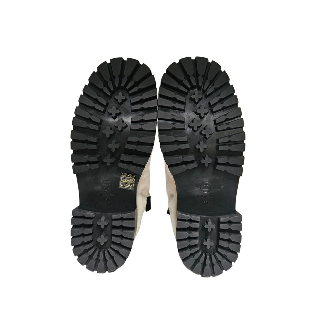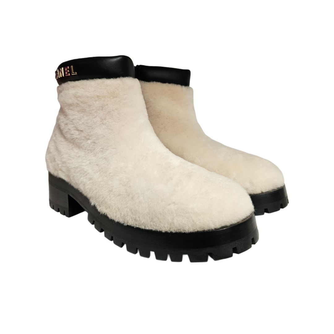Chanel White Leather and Shearling CC Logo Ankle Bootie, Size 39