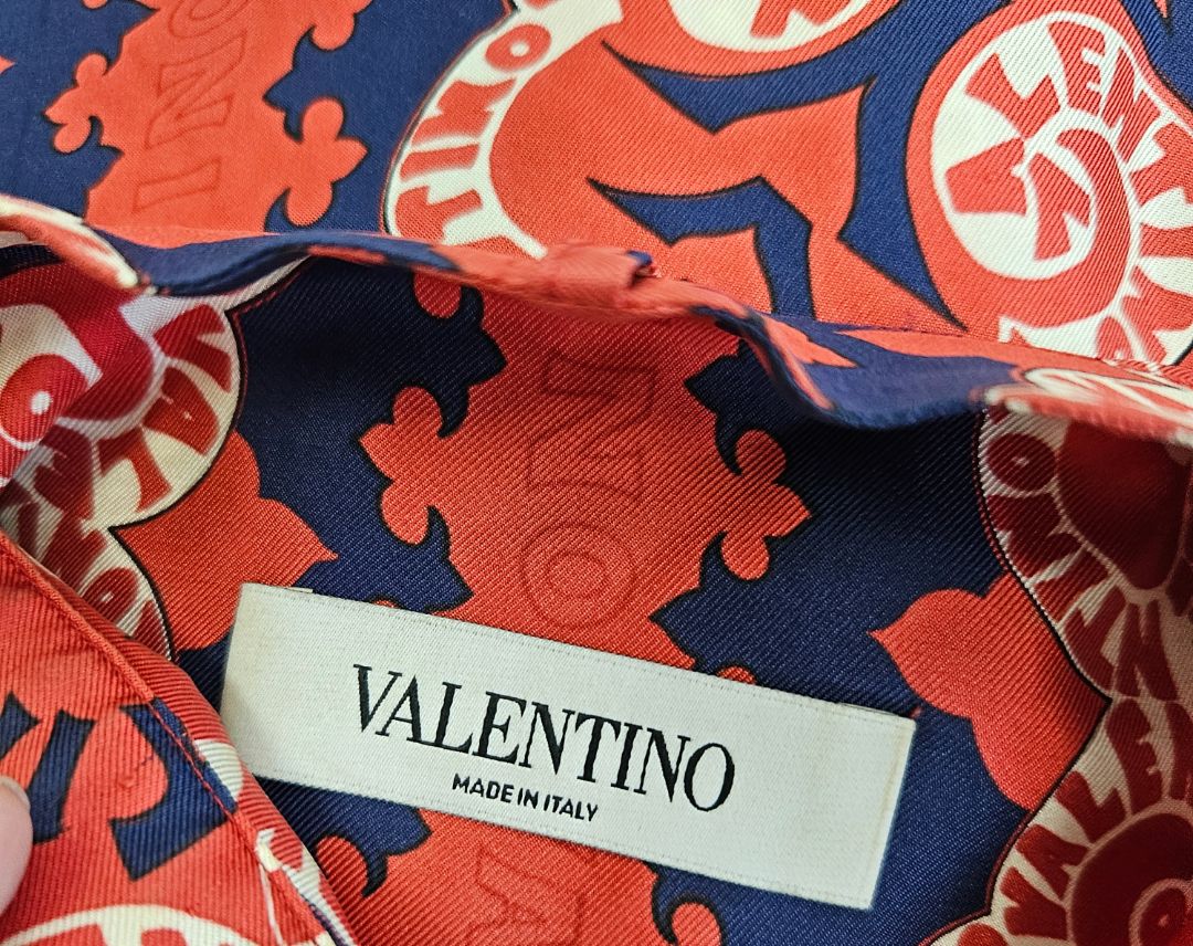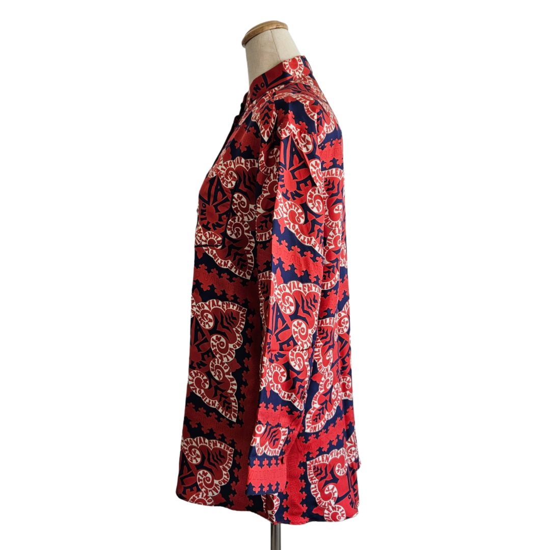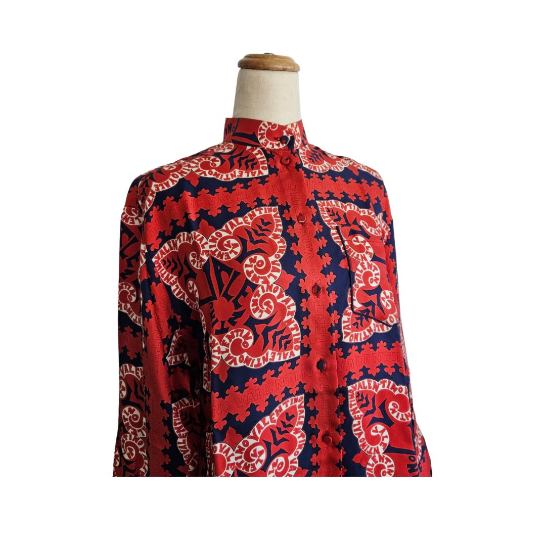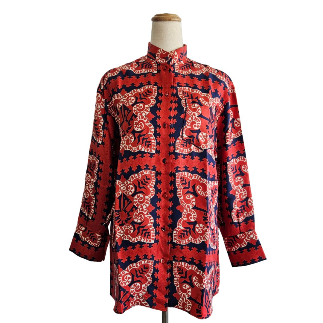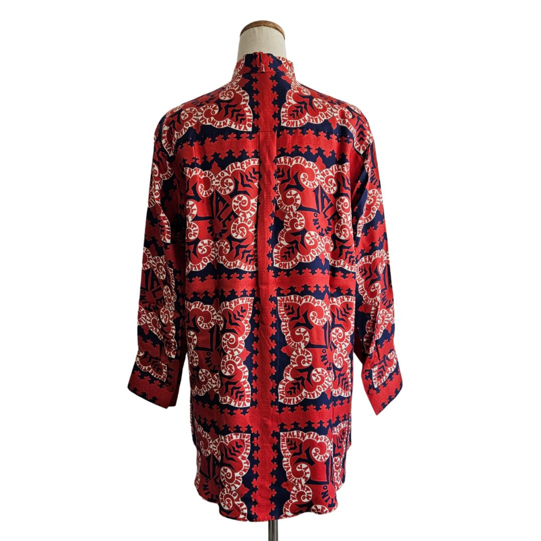 Valentino Red and Navy Printed Silk Button Up Shirt