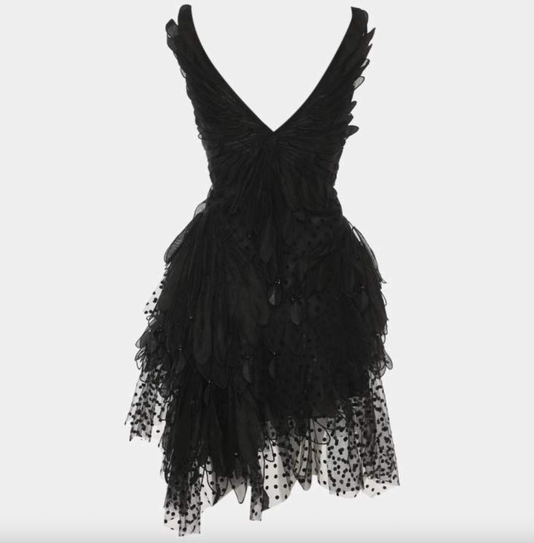 A striking Zimmermann Rhythmic Fluted mini dress in black tulle with feather detailing, a contemporary take on evening elegance.