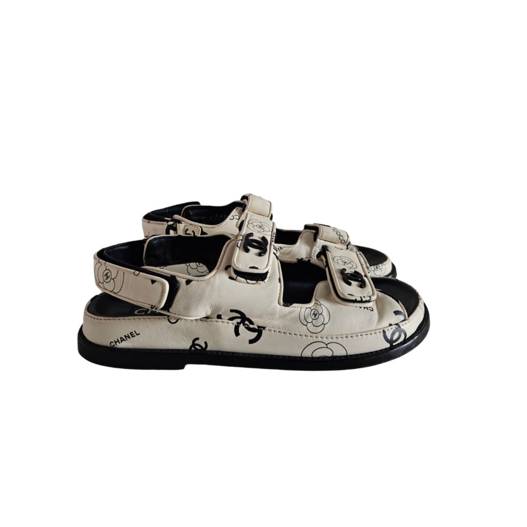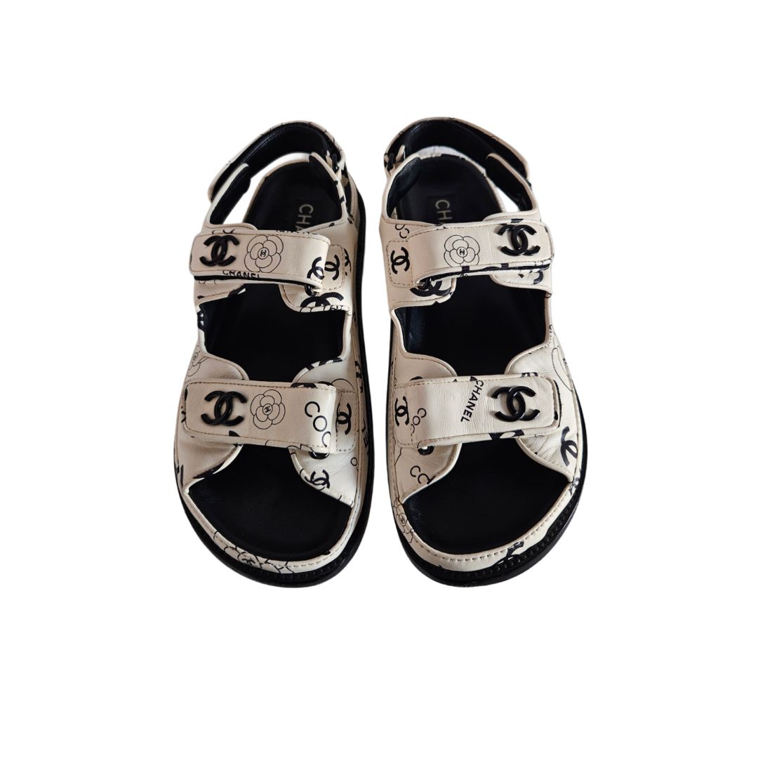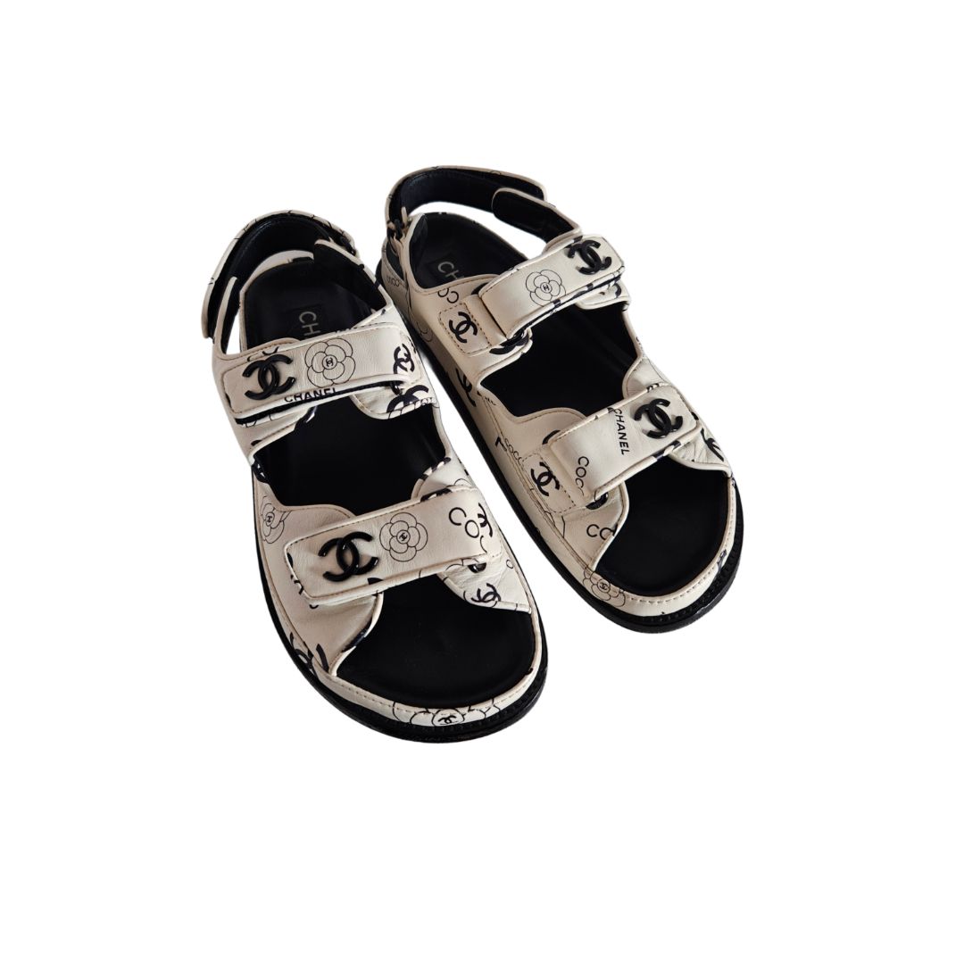 Chanel White & Black CC Leather Dad Flat Sandal, size 38