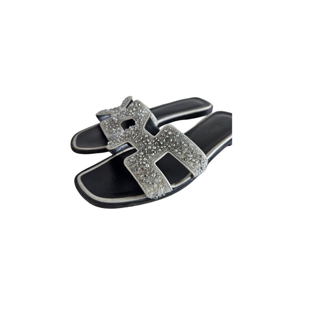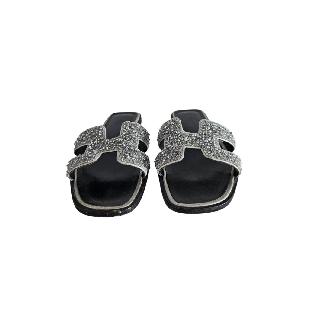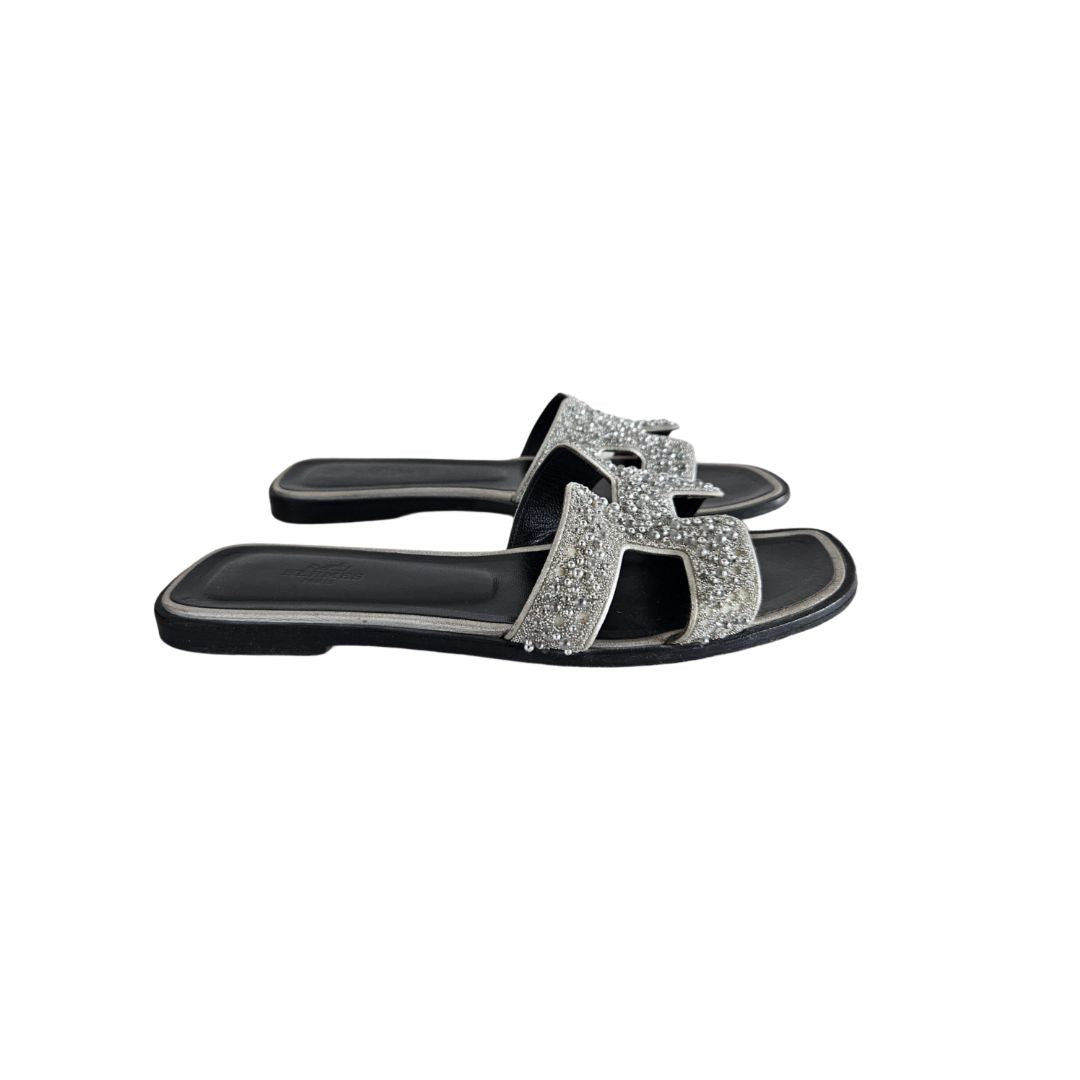 Hermes Grey Beaded Oran Flat Sandal, size 38.5