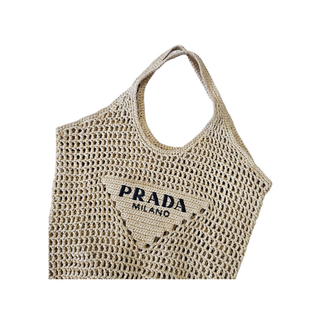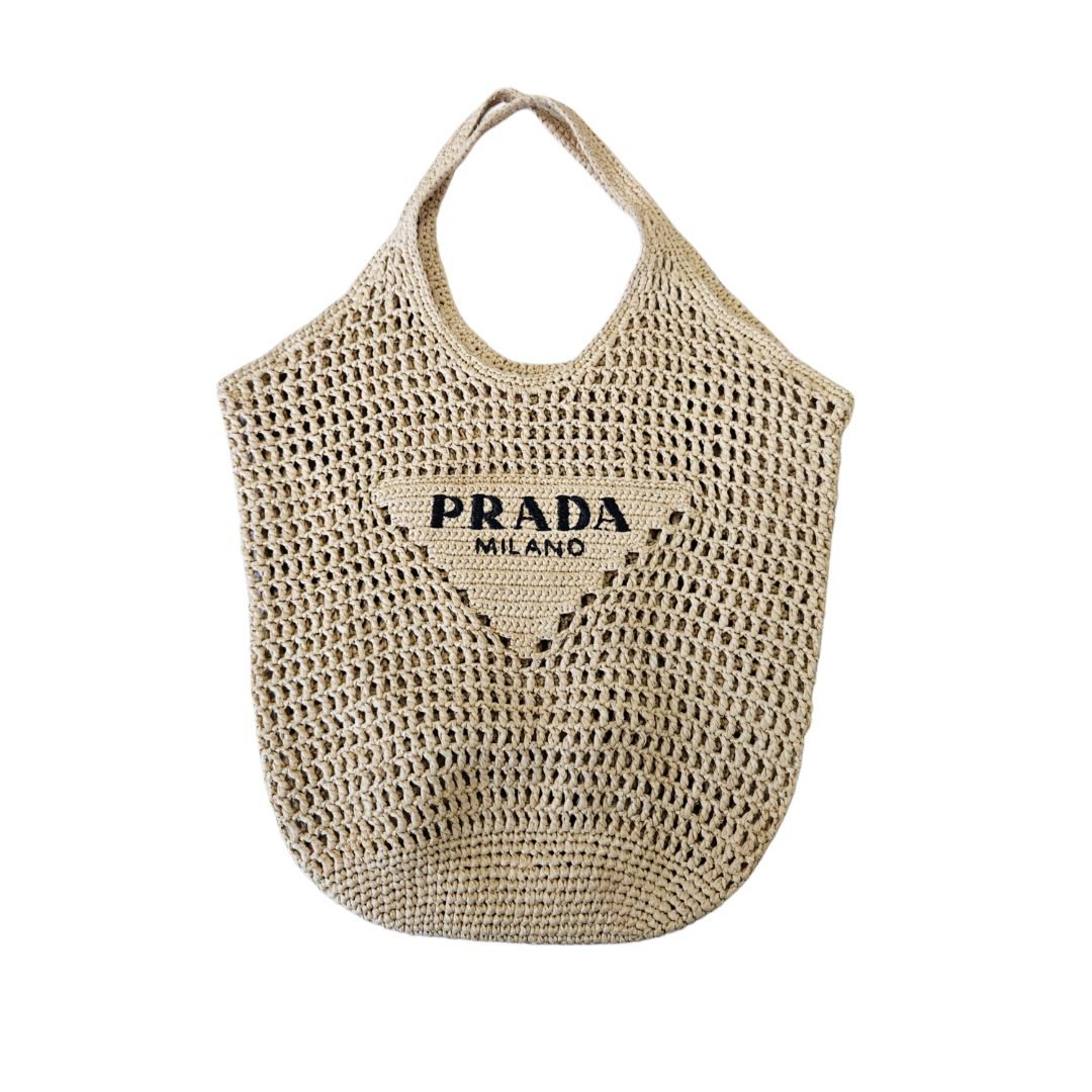 Prada Logo Beige/Black Woven Raffia Beach Bag