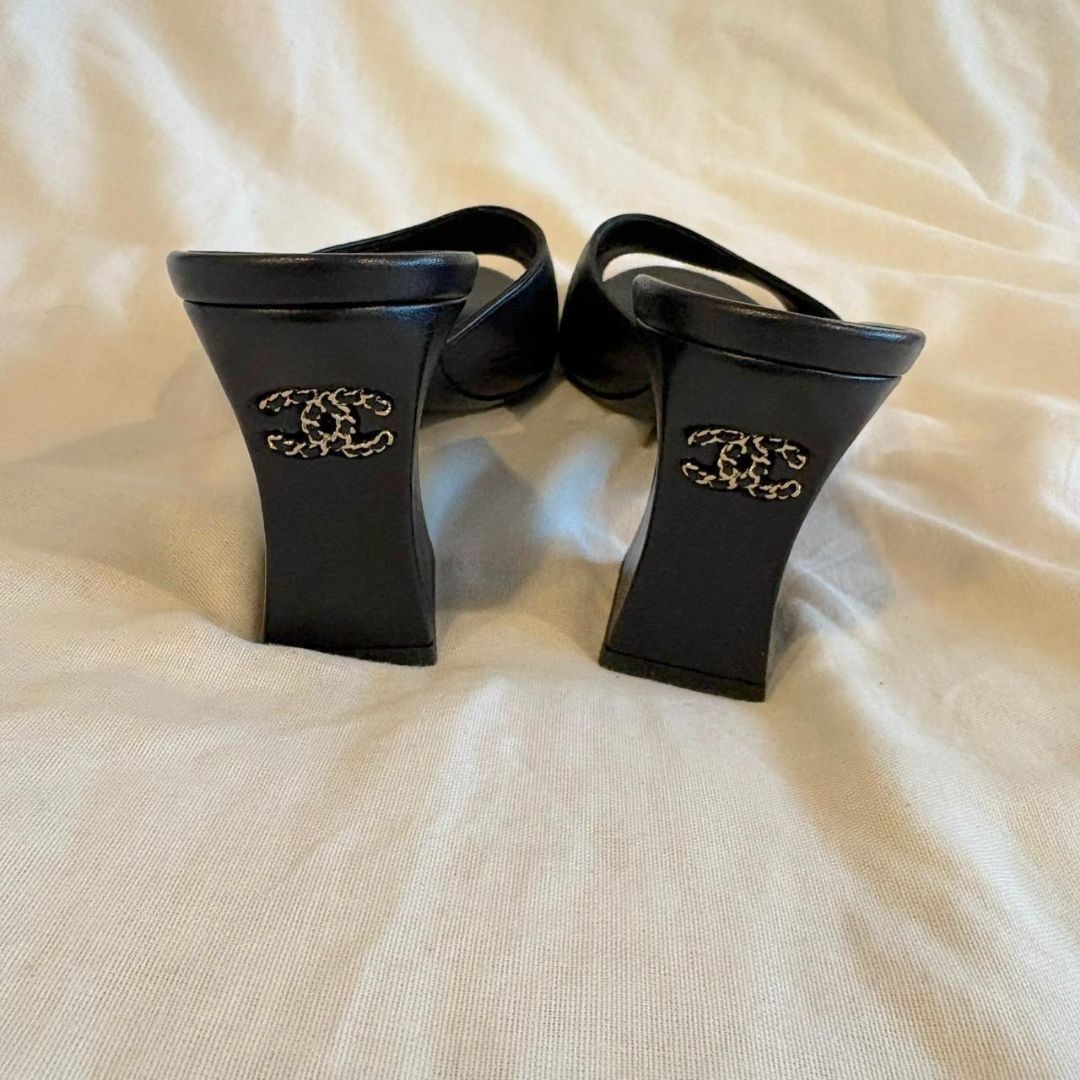 Chanel black leather mule sandals with block heel , CC chain on back