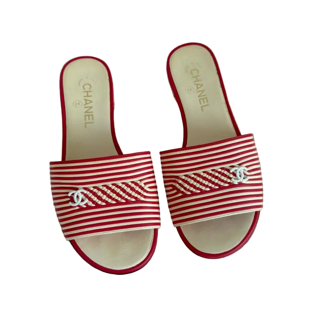 Chanel white and red striped mule slides, size 38