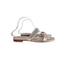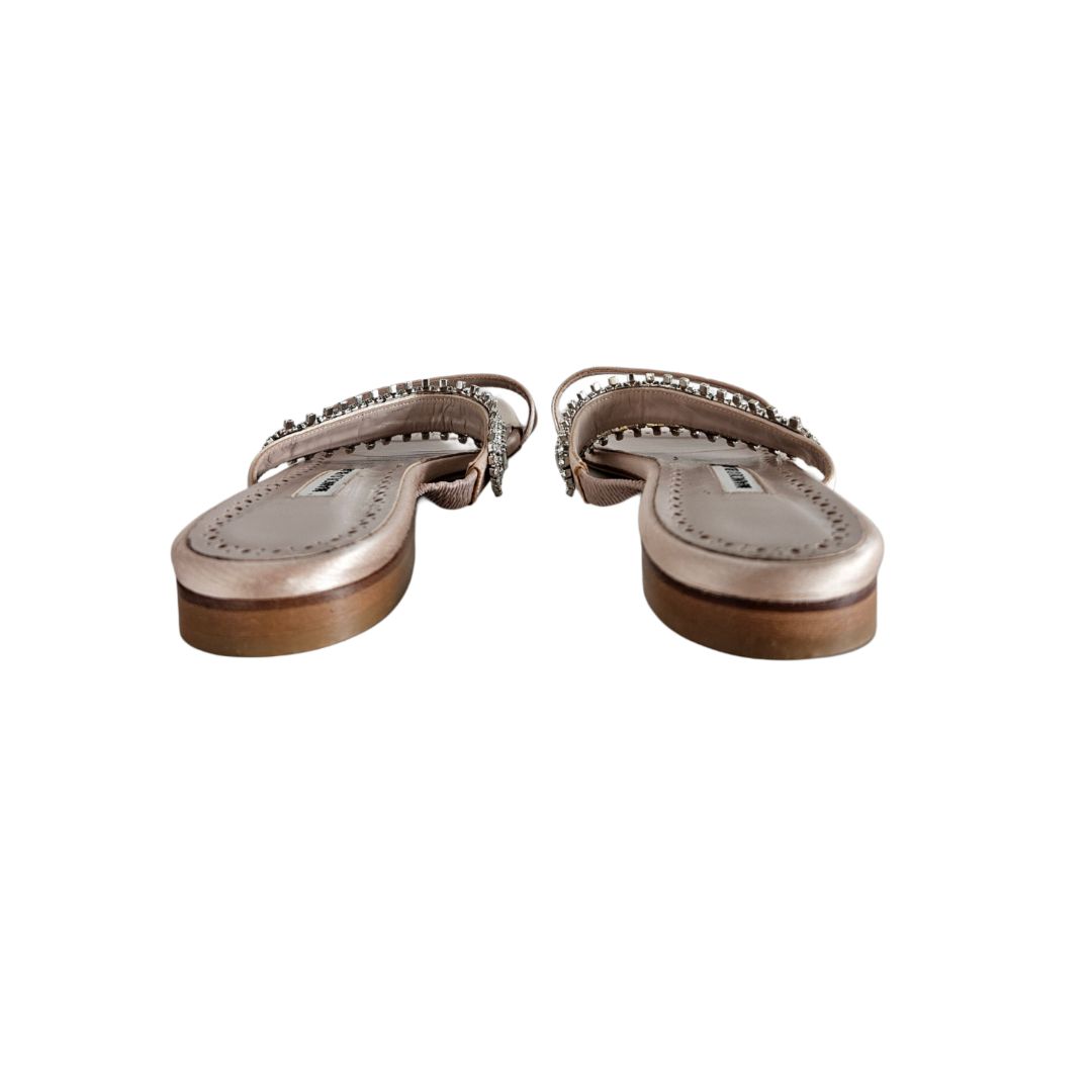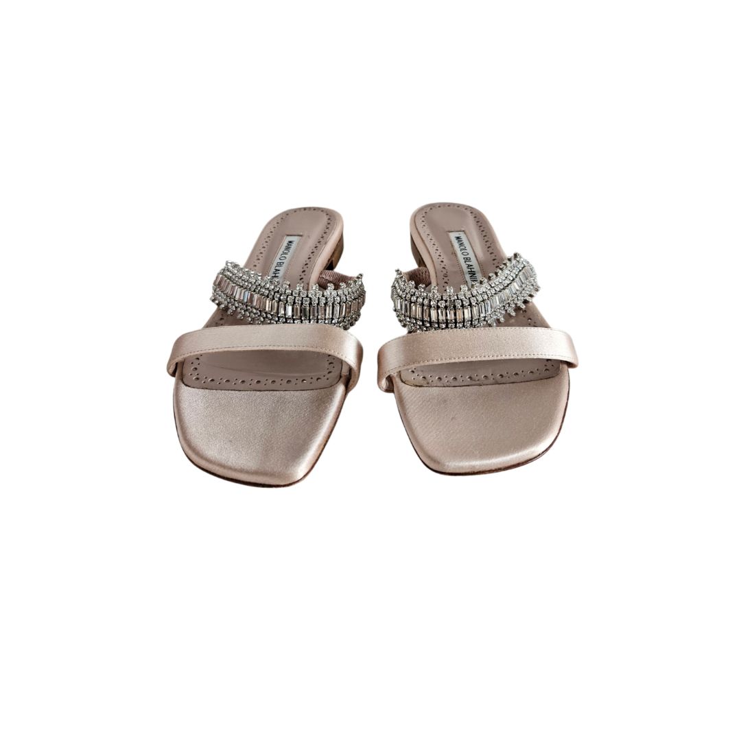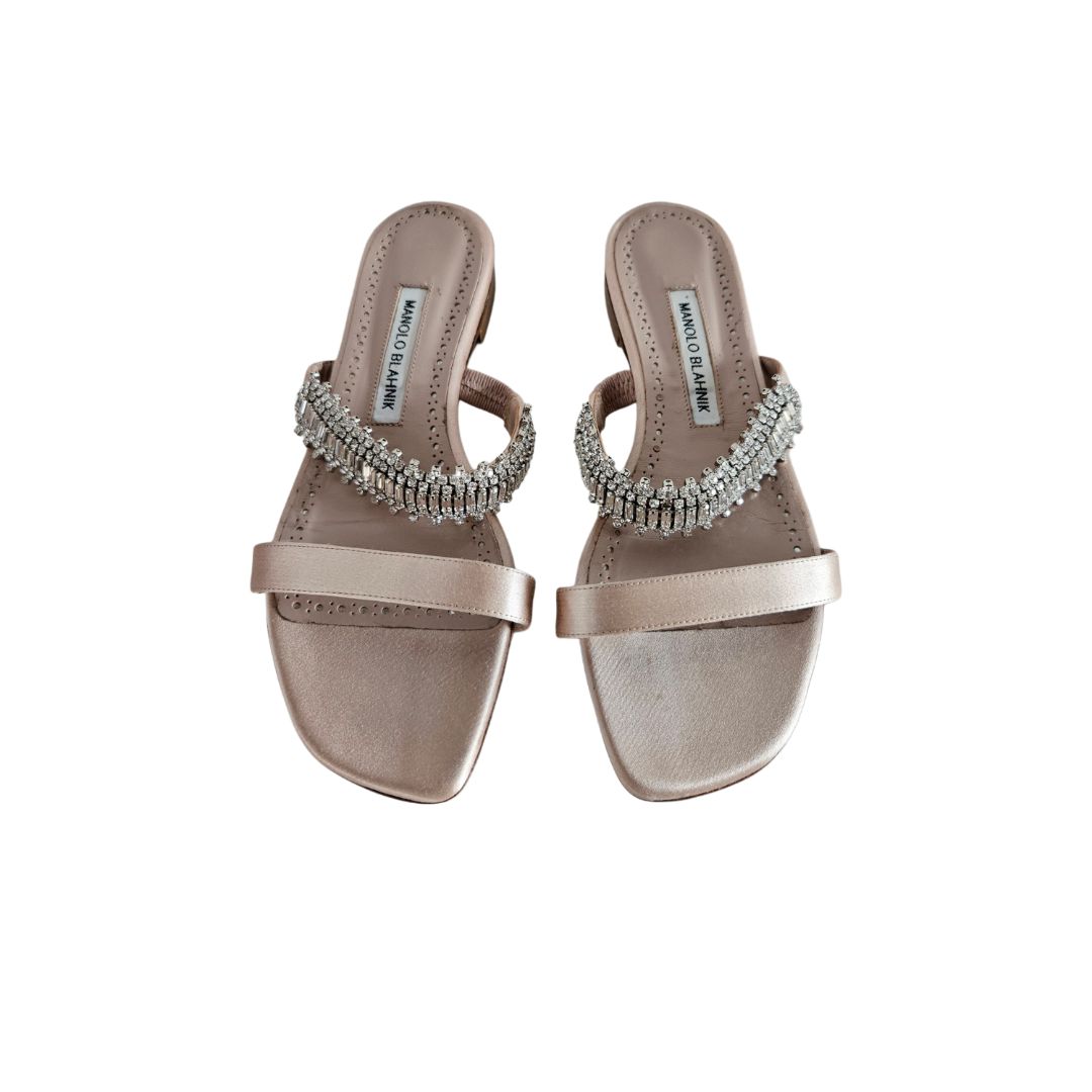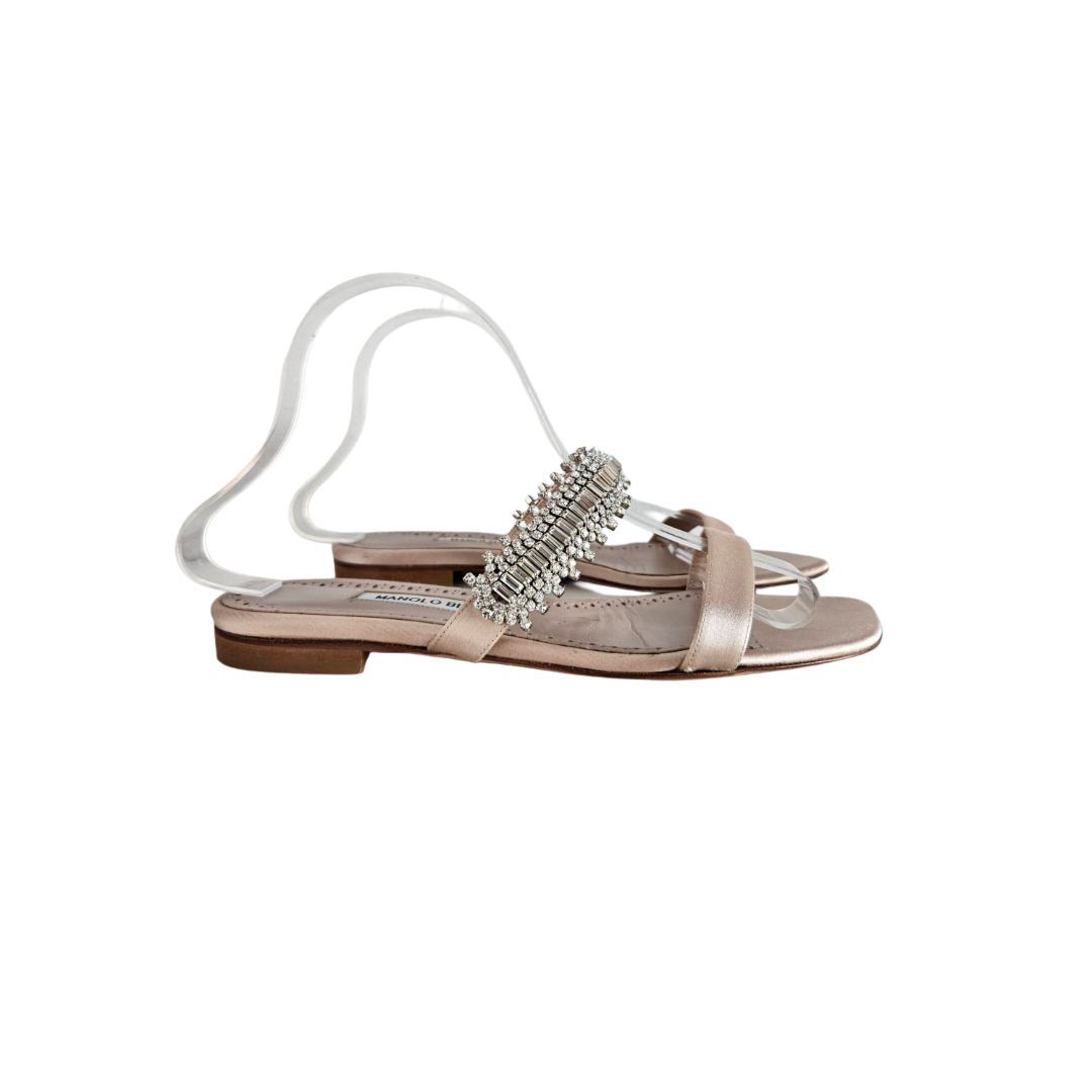 Manolo Blahnik Beige Satin Sakina 10 MM Two Strap Flat Sandal