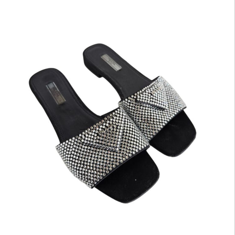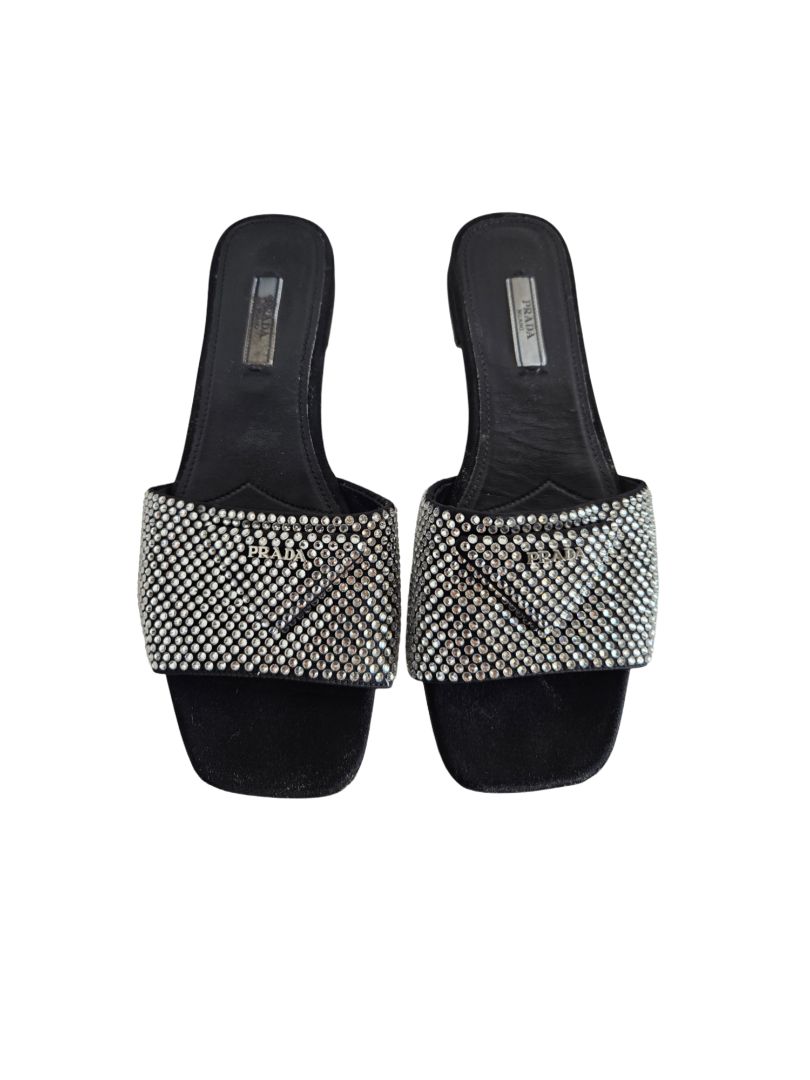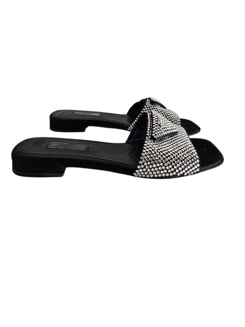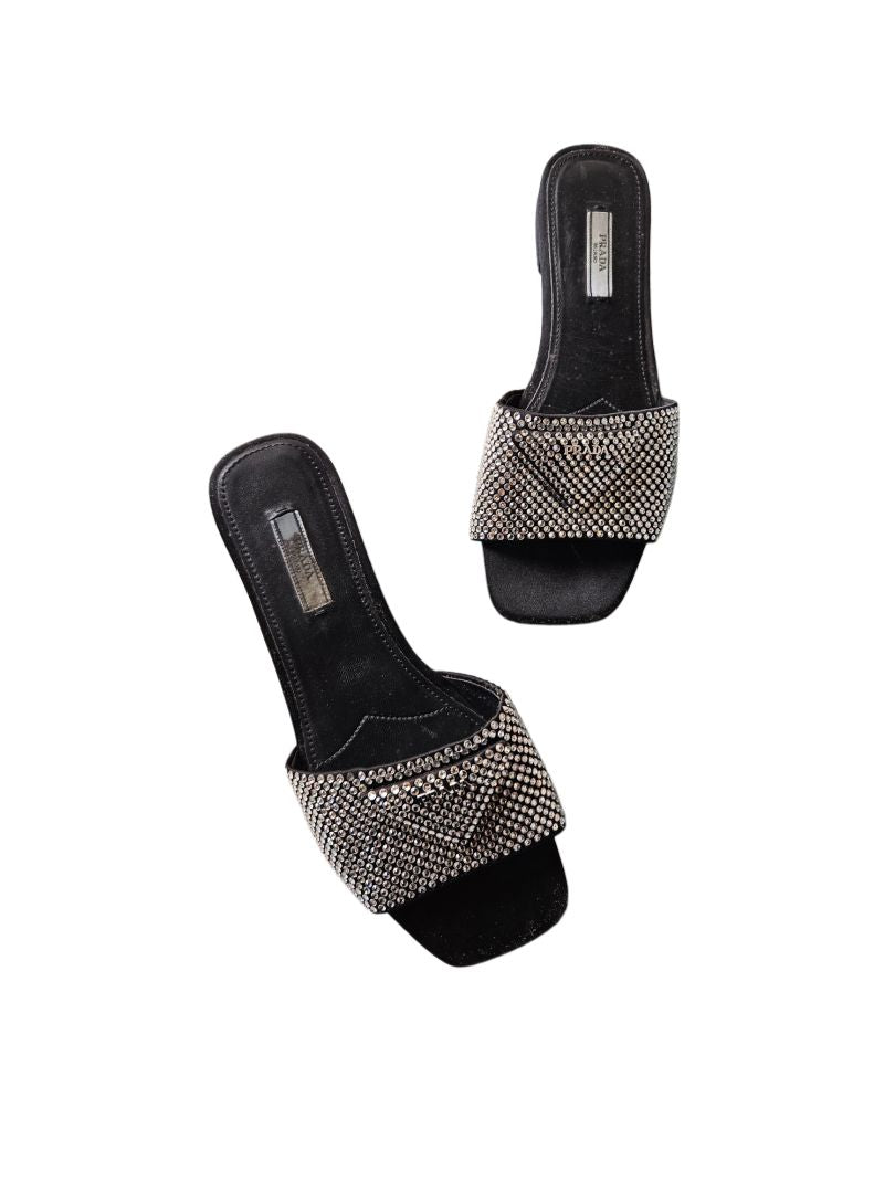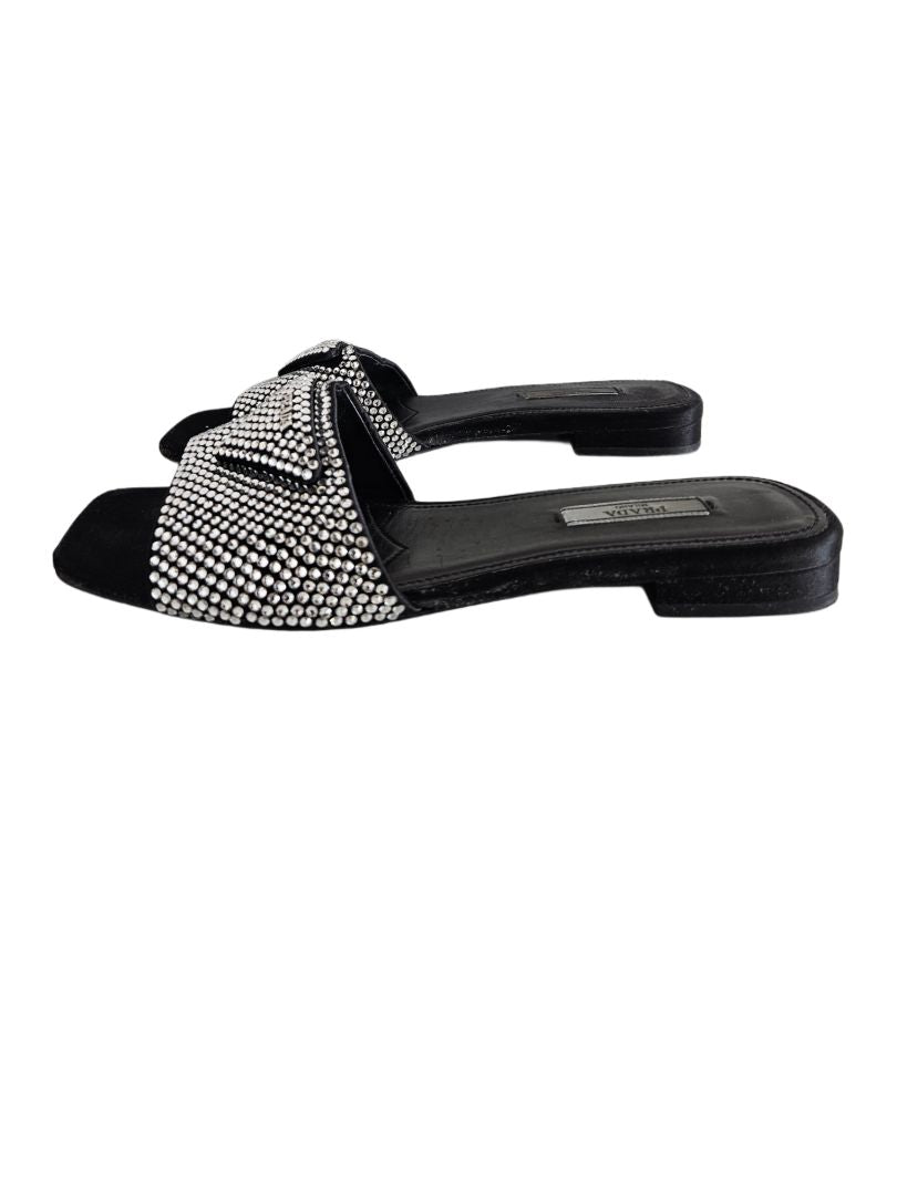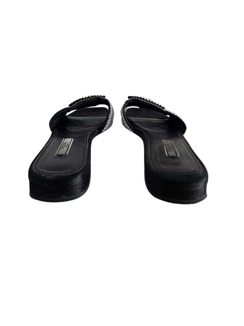 Prada Black Satin Crystal Embellished Flat Slides, size 38.5
