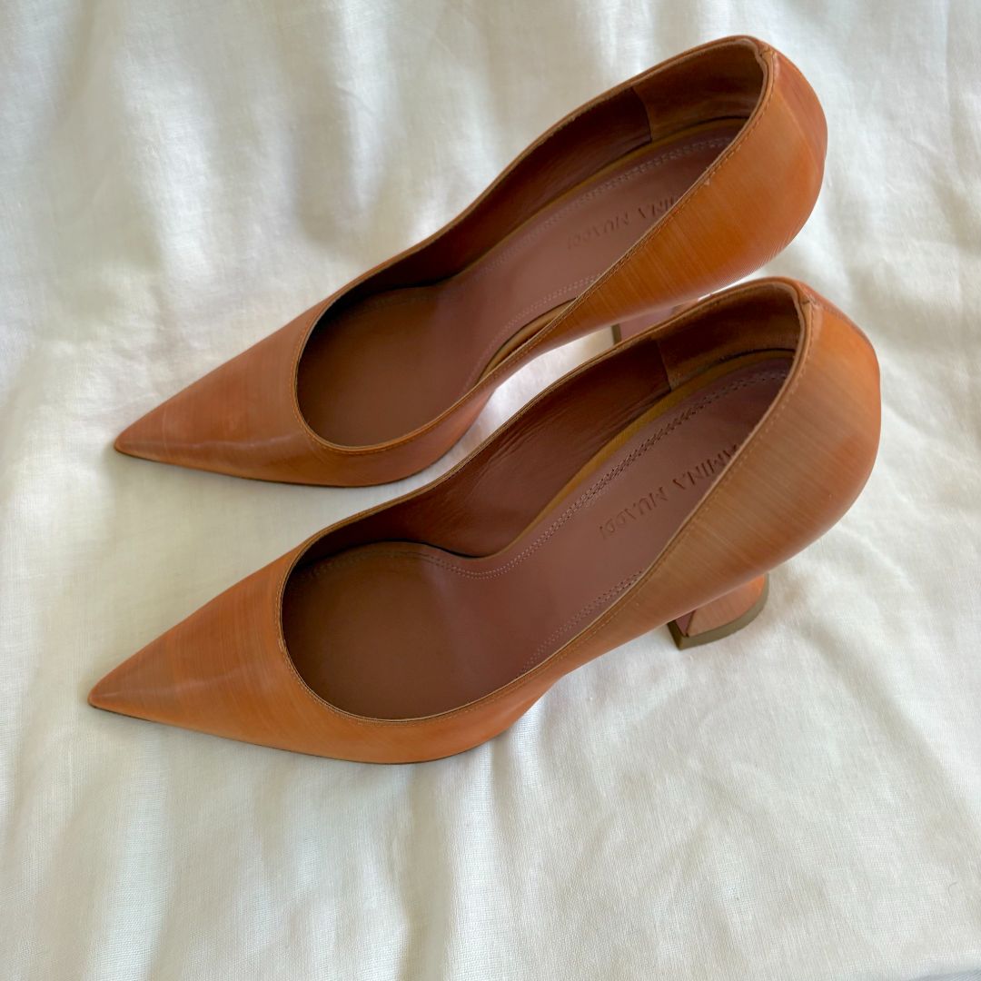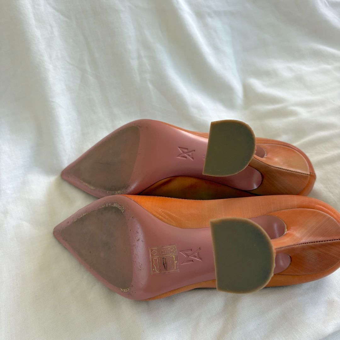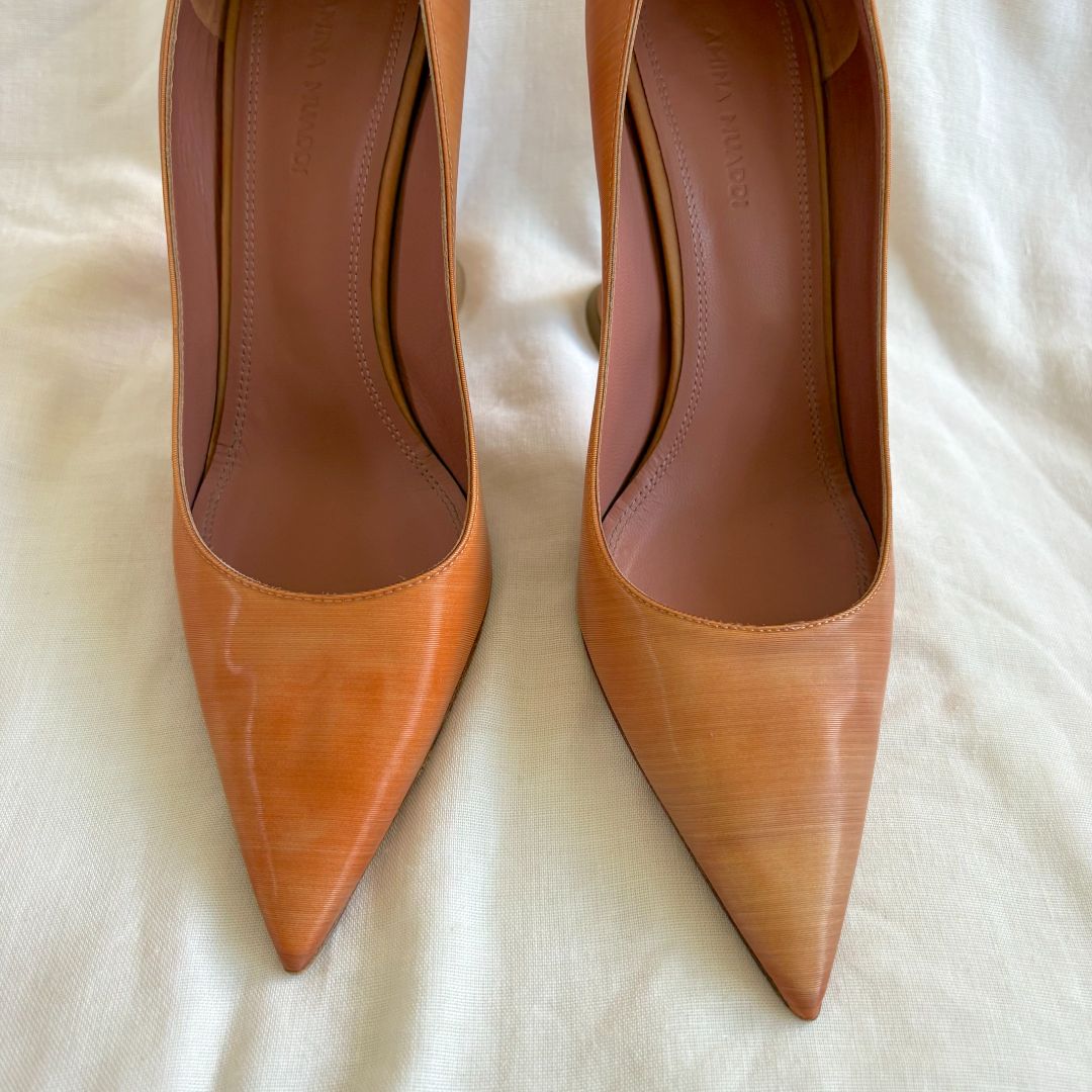 Amina Muaddi brown pointed toe pumps ridged multicolor, size 38