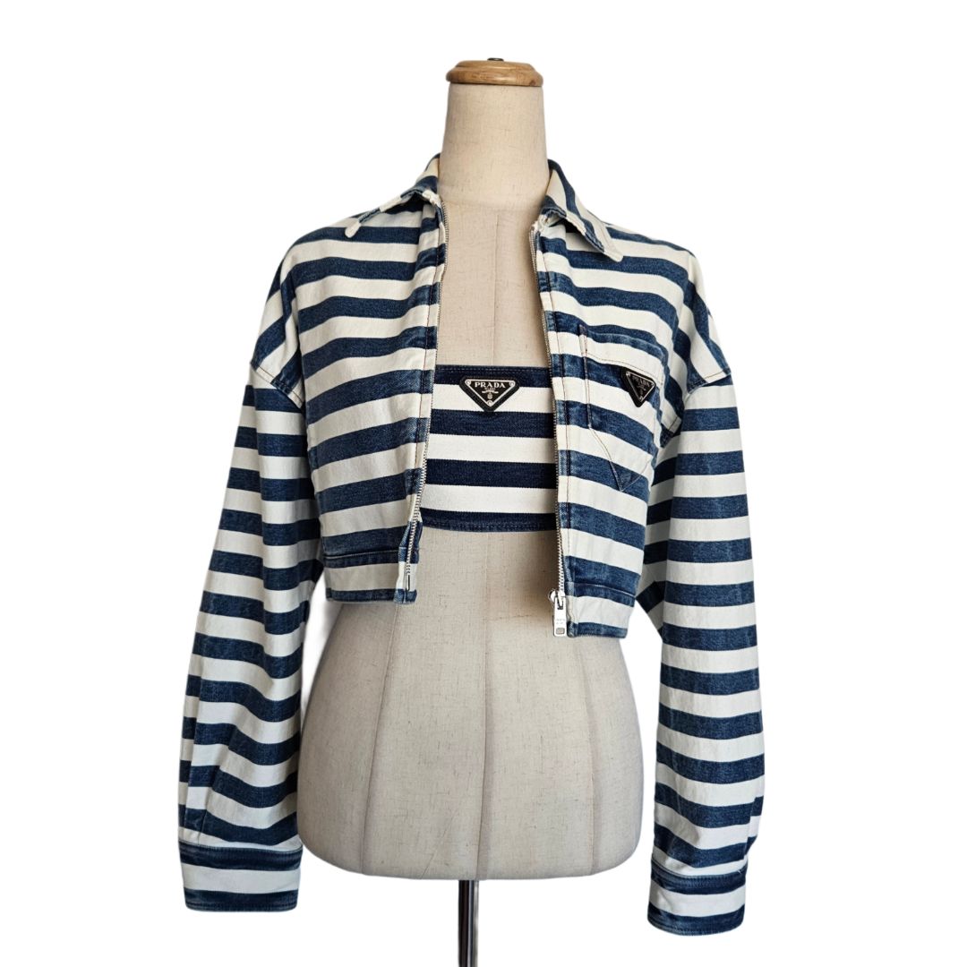 Prada Blue & White Stripped Denim logo Plaque Cropped Top