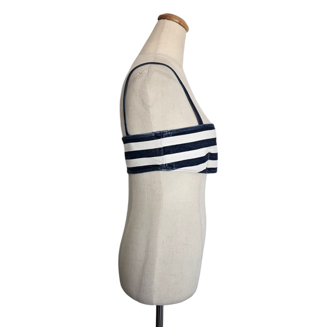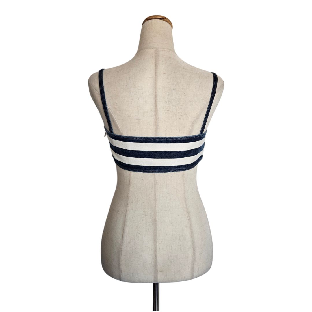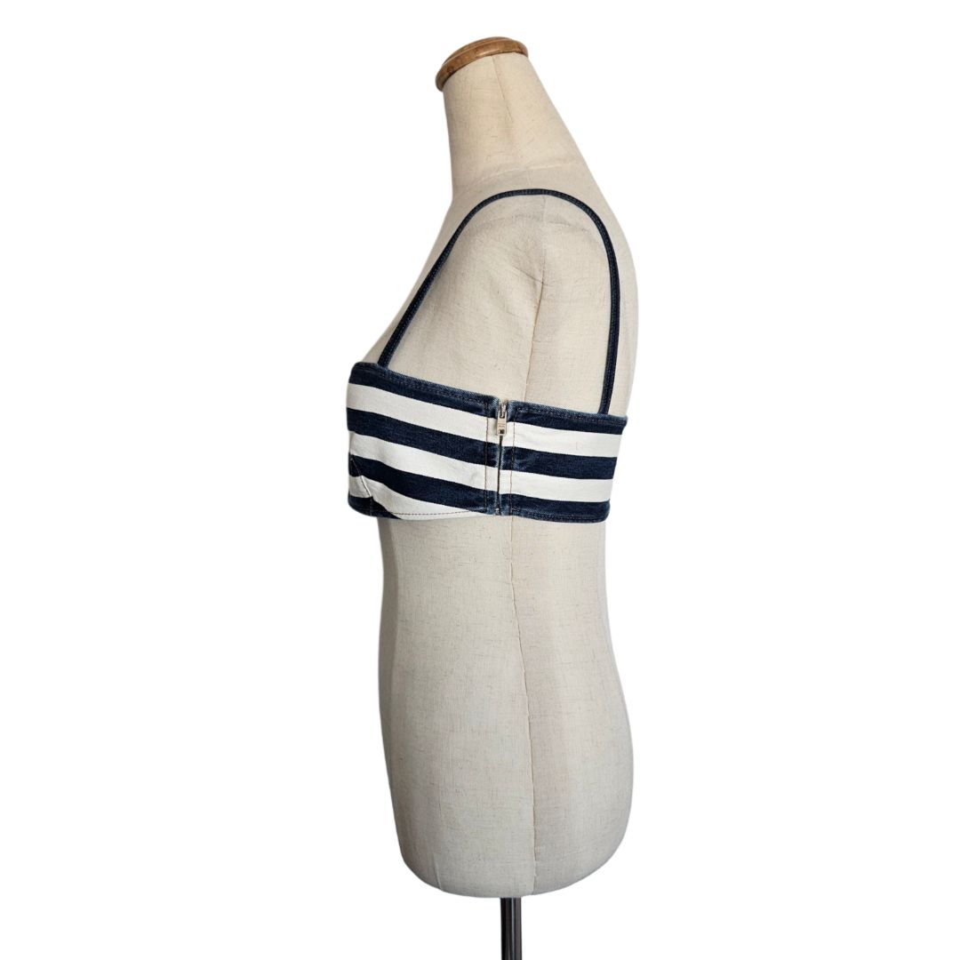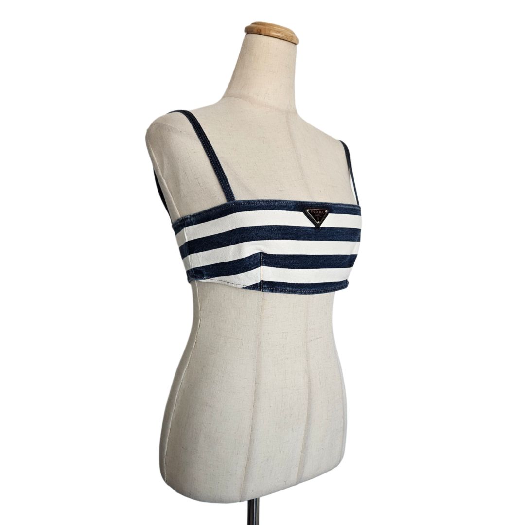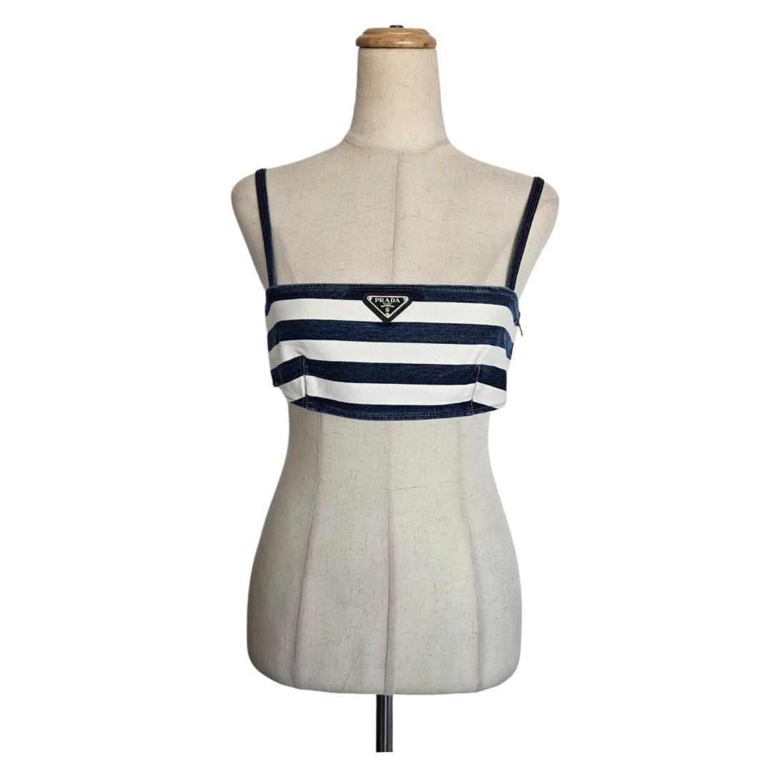 Prada Blue & White Stripped Denim Logo Plaque Cropped Top